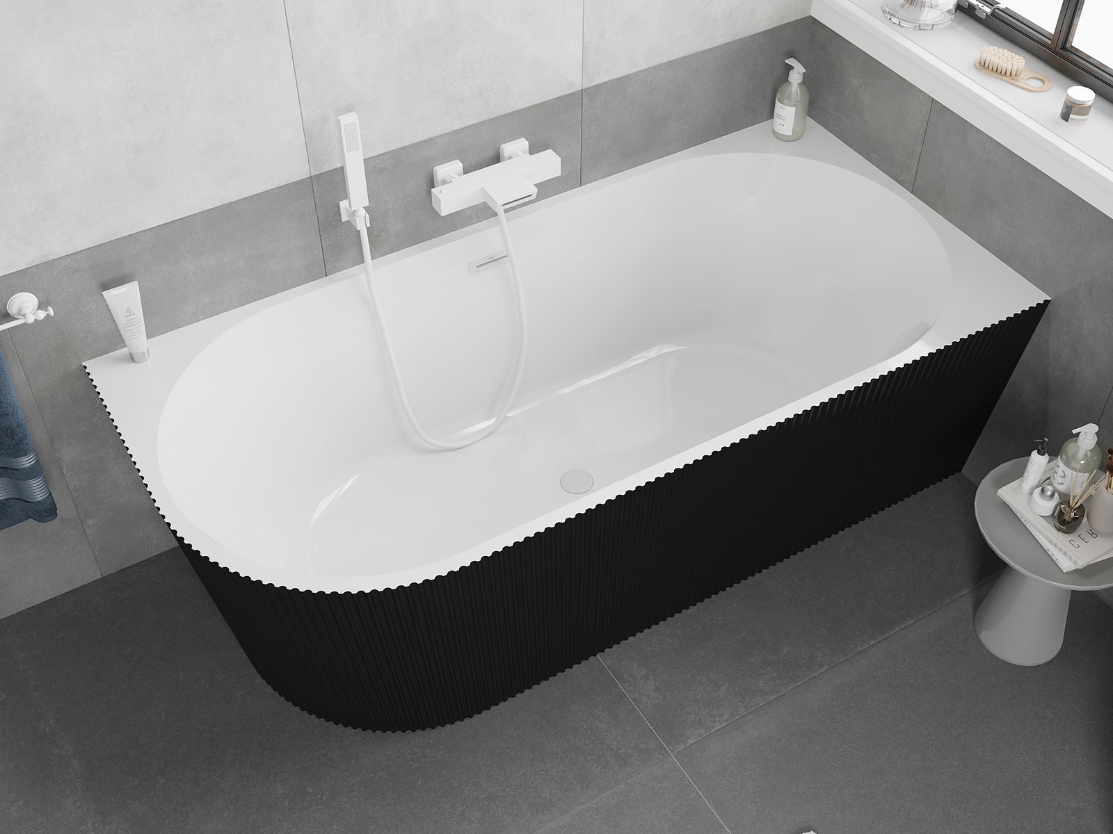 Mexen Silo laisvai stovinti kampinė dešinė rifliuota vonia 170 x 80 cm, balta/juoda, baltas persipylimas - 52891708075P-20