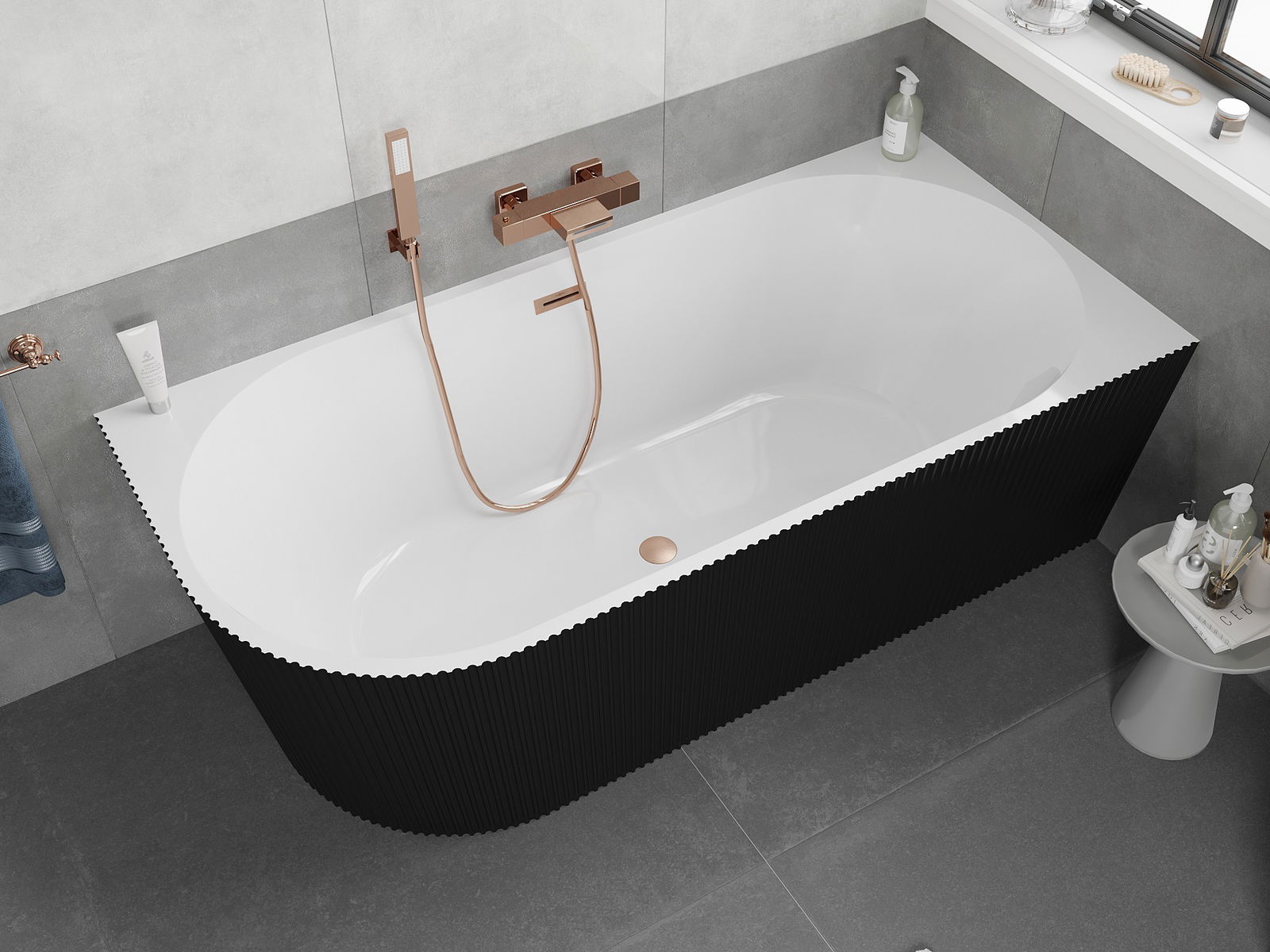 Mexen Silo laisvai stovinti kampinė vonia, dešinė, rifliuota, 170 x 80 cm, balta/juoda, šepečiu valyta vario perpylimo anga