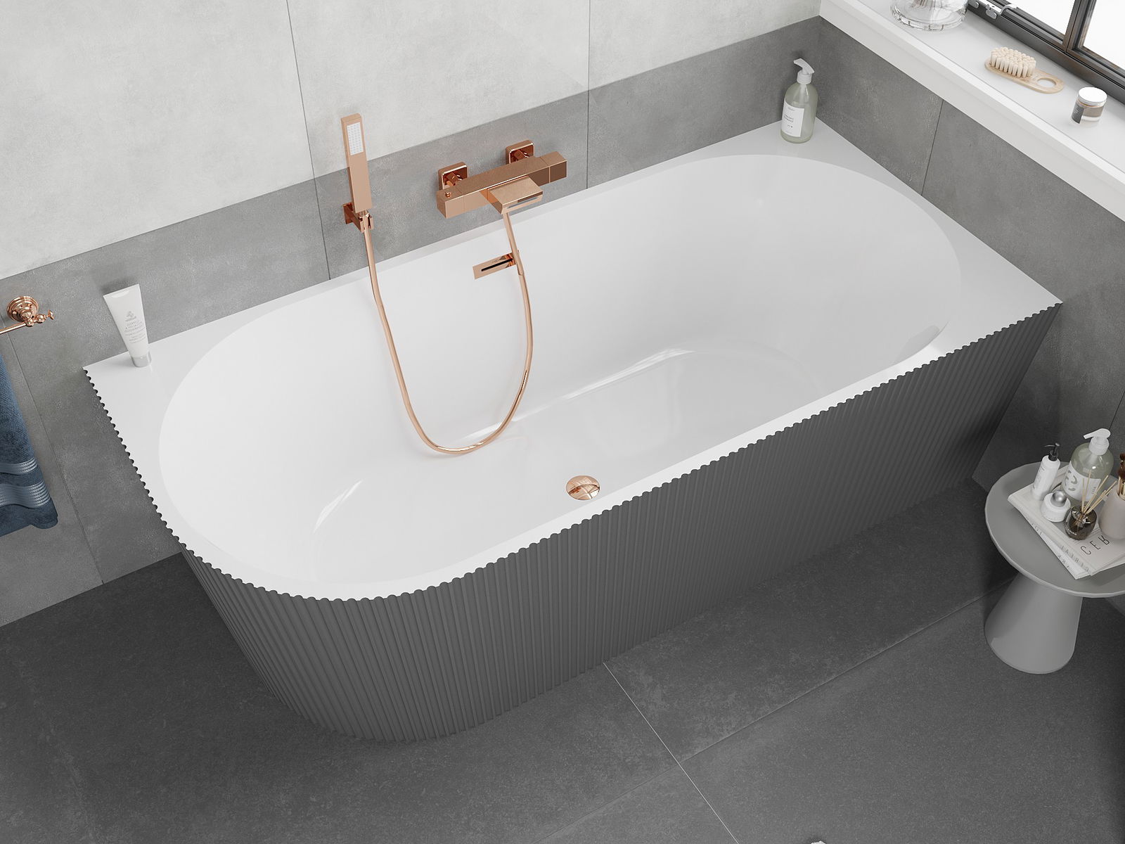 Mexen Silo laisvai pastatoma kampinė vonia, dešinysis rifliuotas 150 x 75 cm, balta/pilka, perpylimas rožinis auksas