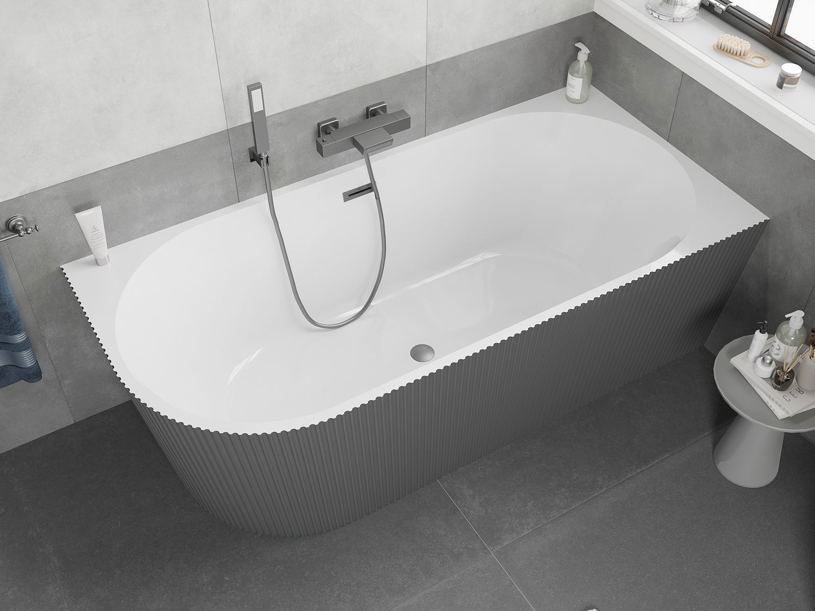 Mexen Silo laisvai stovinti kampinė vingiuota vonia dešinė 170 x 80 cm, balta/pilka, perdengimas šepetuotas gun gray