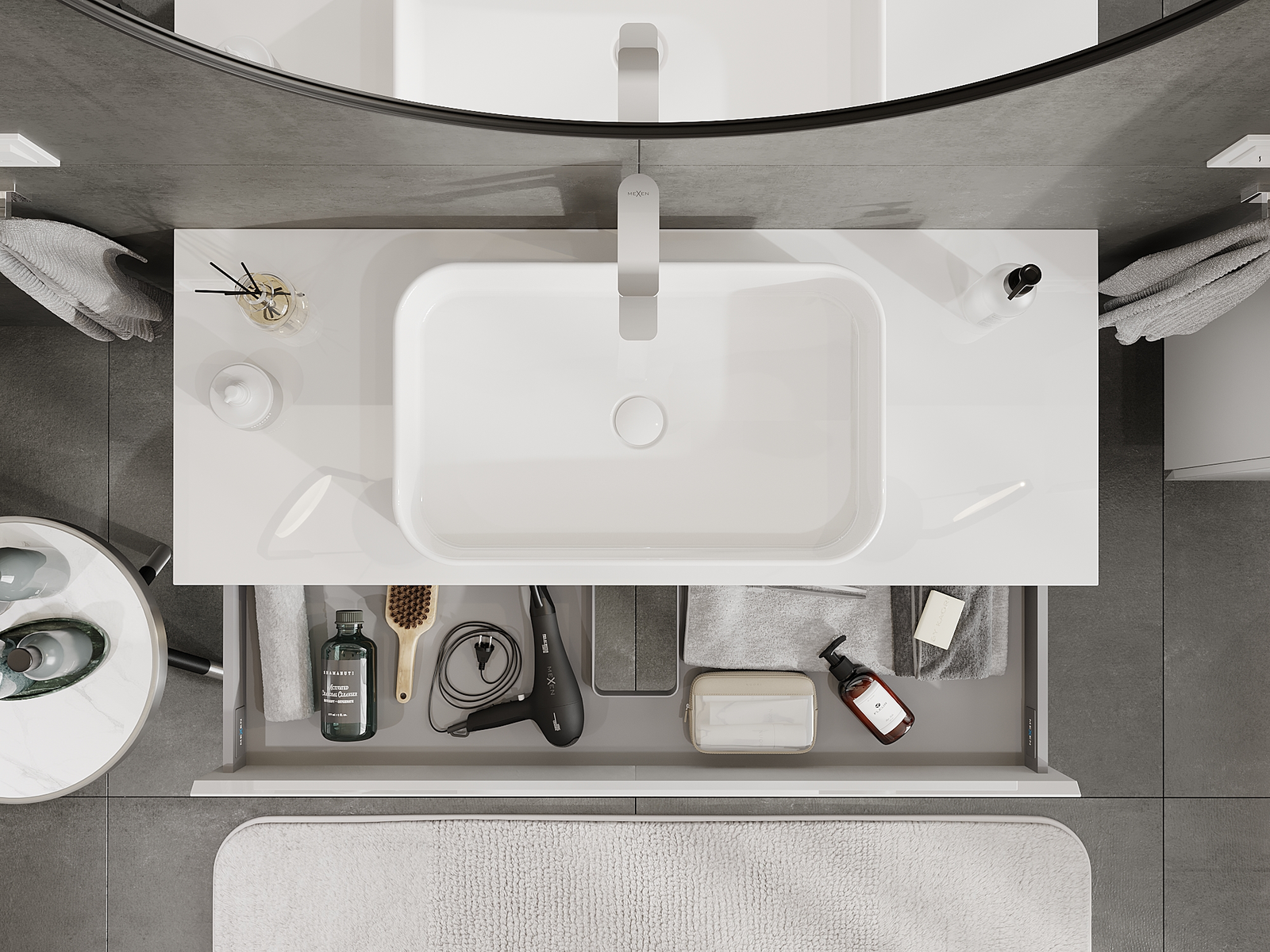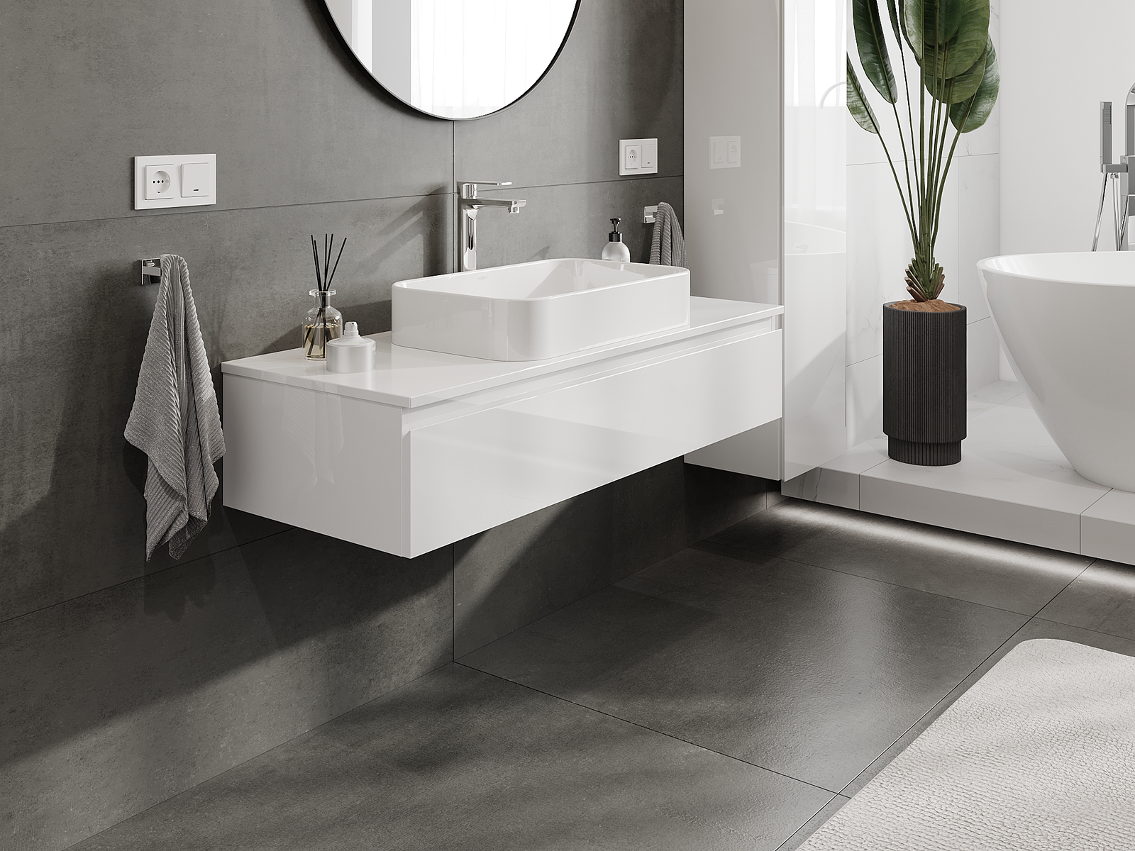 Mūsų moduliniai vonios baldai gali būti derinami tarpusavyje įvairiomis spalvų konfigūracijomis, leidžiant visiškai pritaikyti pagal asmeninius poreikius. Galima pasirinkti tiek atskirų elementų išvaizdą, tiek funkcijas, kas leidžia baldus pritaikyti pagal savo stiliaus ir naudojimo preferencijas.