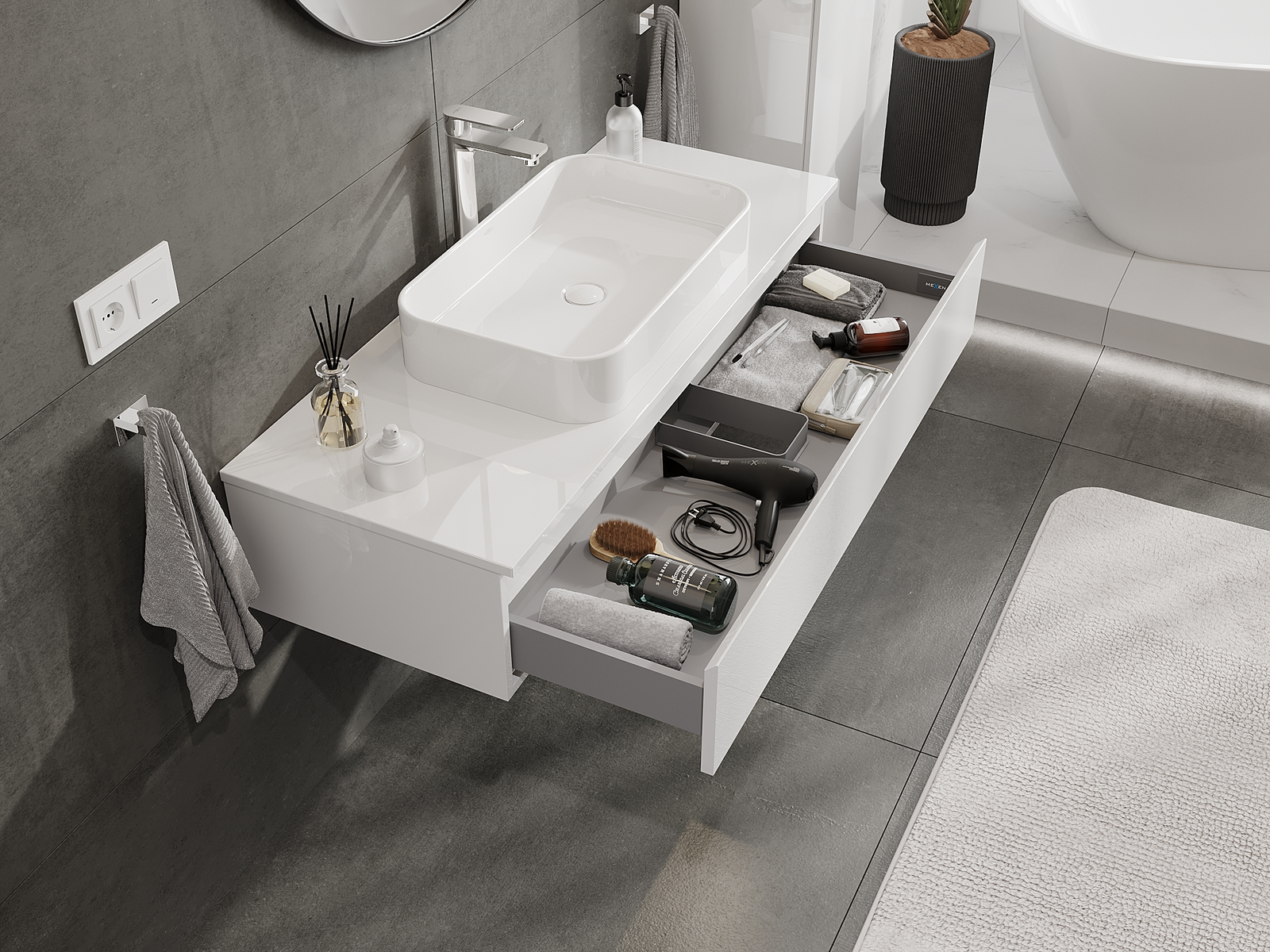 Mexen Orio vonios kambario spintelė po praustuvu 120 cm, 1 stalčius, blizgi balta - 91A10-12023-1-BF00