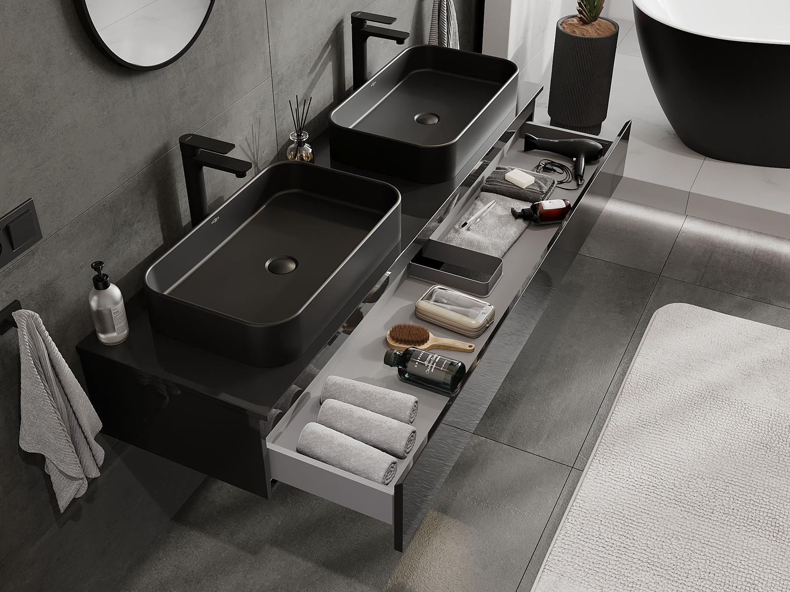 Mūsų moduliniai vonios baldai gali būti derinami tarpusavyje įvairiomis spalvų konfigūracijomis, leidžiant visiškai pritaikyti pagal asmeninius poreikius. Galima pasirinkti tiek atskirų elementų išvaizdą, tiek funkcijas, kas leidžia baldus pritaikyti pagal savo stiliaus ir naudojimo preferencijas.