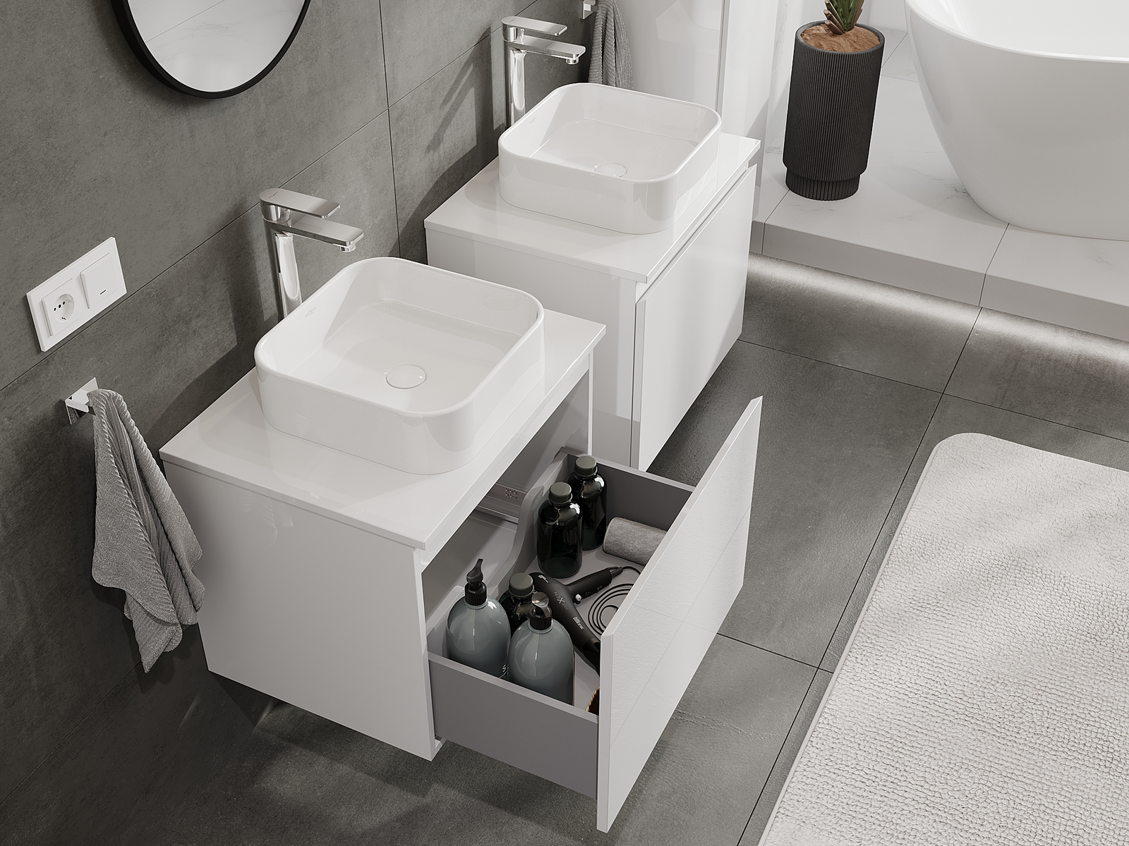 Mūsų moduliniai vonios baldai gali būti derinami tarpusavyje įvairiomis spalvų konfigūracijomis, leidžiant visiškai pritaikyti pagal asmeninius poreikius. Galima pasirinkti tiek atskirų elementų išvaizdą, tiek funkcijas, kas leidžia baldus pritaikyti pagal savo stiliaus ir naudojimo preferencijas.