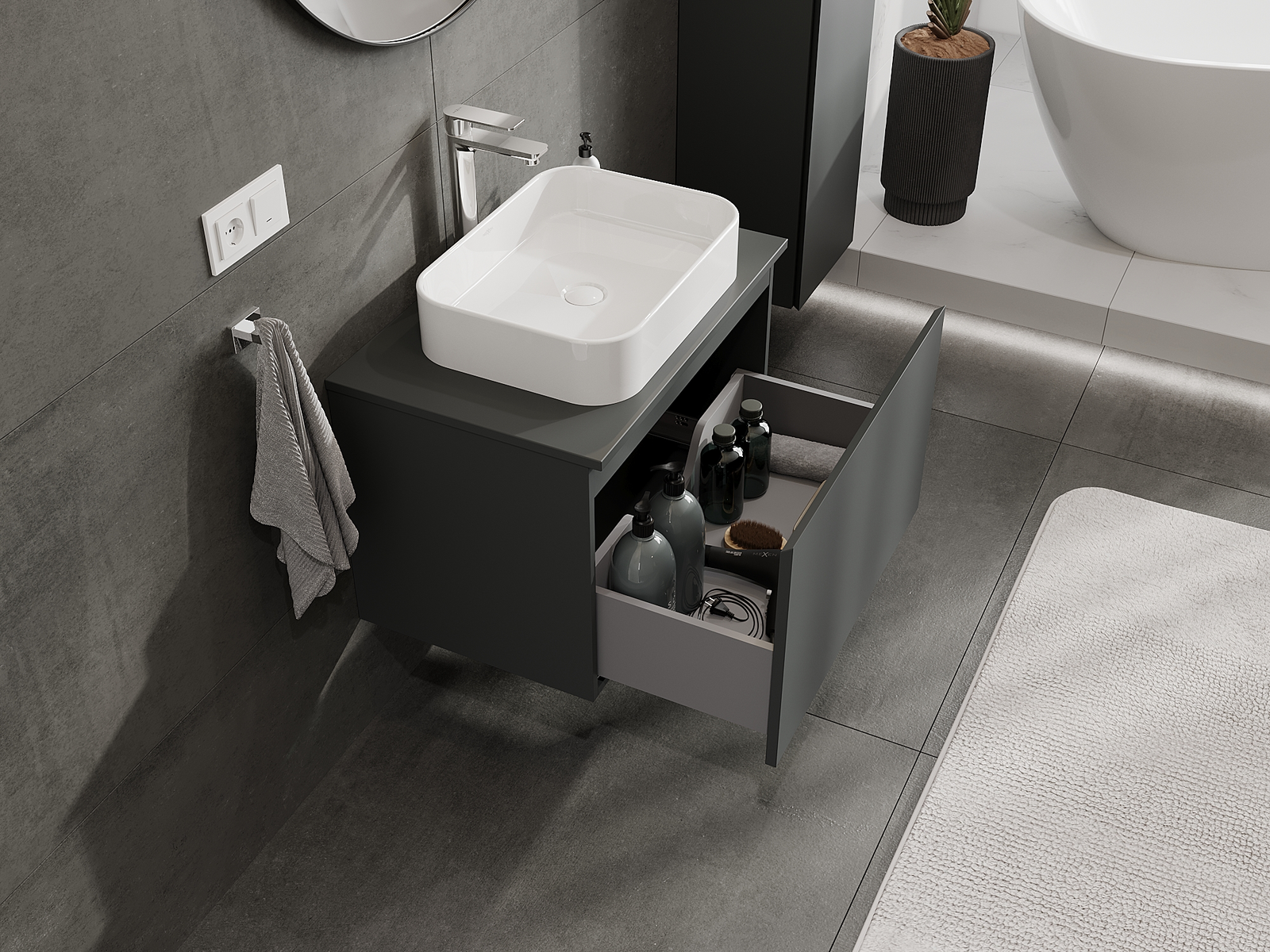 Mūsų moduliniai vonios baldai gali būti derinami tarpusavyje įvairiomis spalvų konfigūracijomis, leidžiant visiškai pritaikyti pagal asmeninius poreikius. Galima pasirinkti tiek atskirų elementų išvaizdą, tiek funkcijas, kas leidžia baldus pritaikyti pagal savo stiliaus ir naudojimo preferencijas.