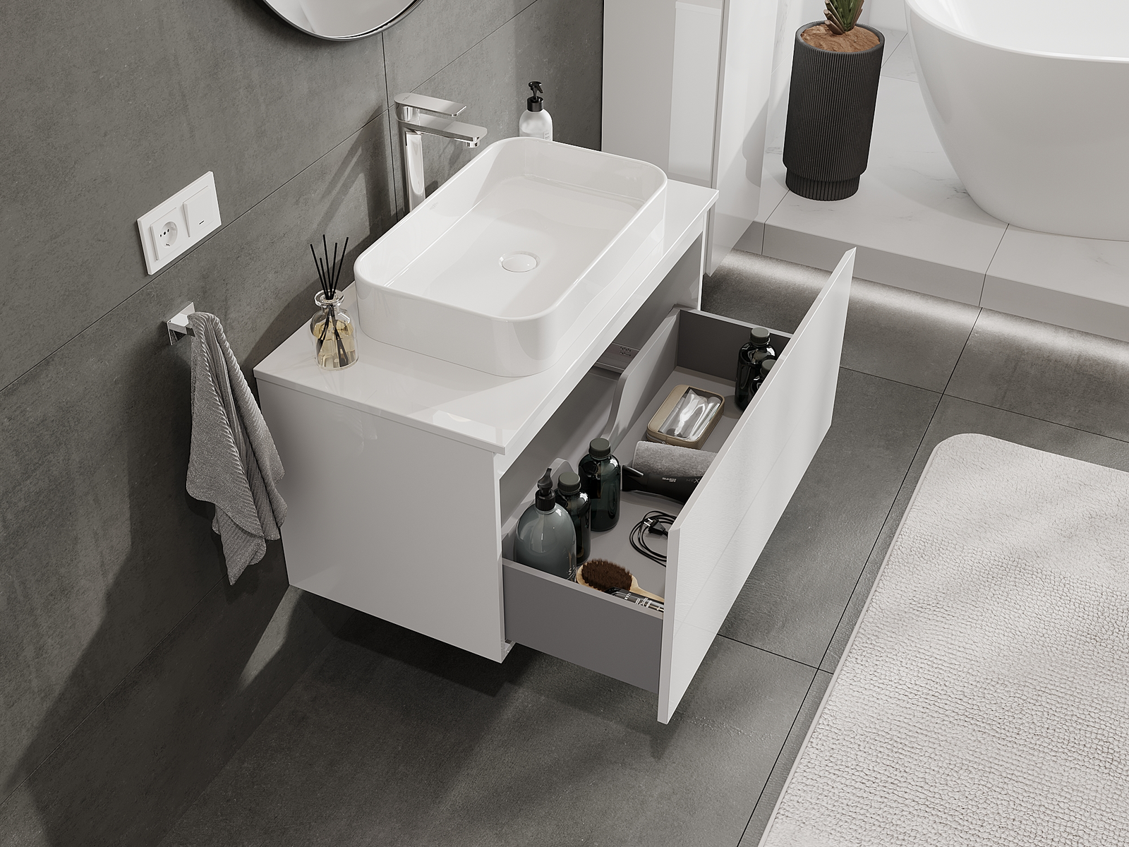 Mūsų moduliniai vonios baldai gali būti derinami tarpusavyje įvairiomis spalvų konfigūracijomis, leidžiant visiškai pritaikyti pagal asmeninius poreikius. Galima pasirinkti tiek atskirų elementų išvaizdą, tiek funkcijas, kas leidžia baldus pritaikyti pagal savo stiliaus ir naudojimo preferencijas.