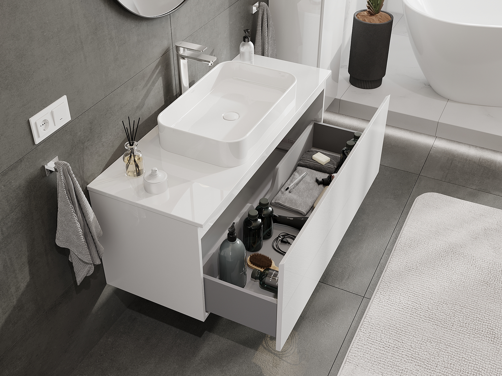 Mūsų moduliniai vonios baldai gali būti derinami tarpusavyje įvairiomis spalvų konfigūracijomis, leidžiant visiškai pritaikyti pagal asmeninius poreikius. Galima pasirinkti tiek atskirų elementų išvaizdą, tiek funkcijas, kas leidžia baldus pritaikyti pagal savo stiliaus ir naudojimo preferencijas.