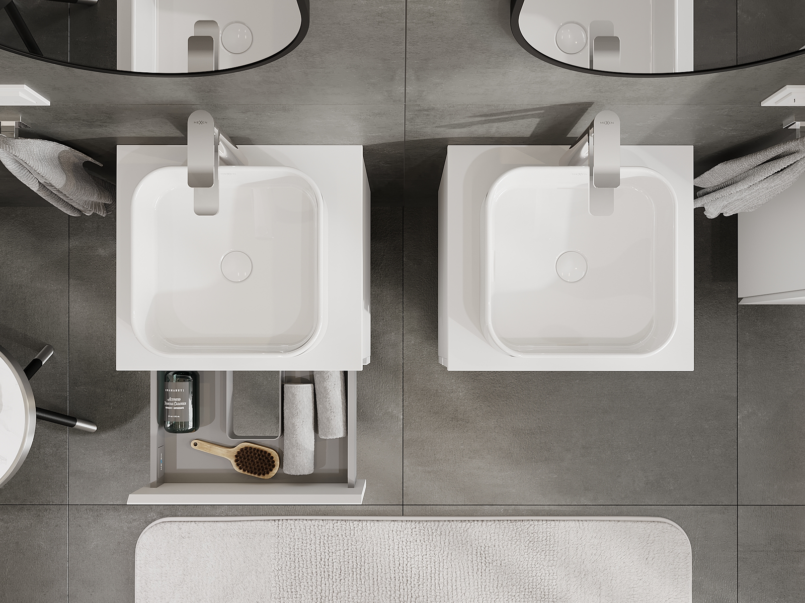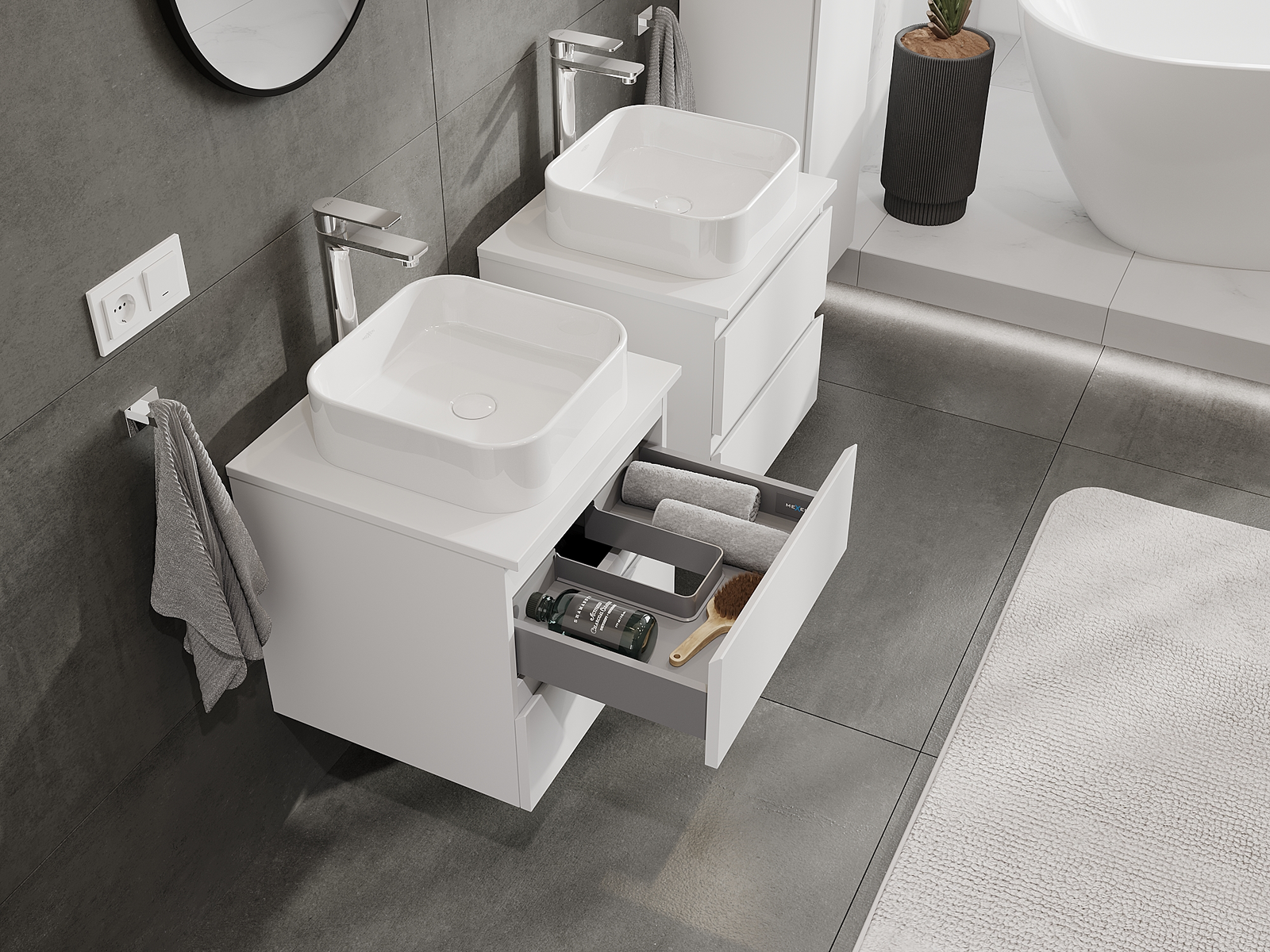 Mūsų moduliniai vonios baldai gali būti derinami tarpusavyje įvairiomis spalvų konfigūracijomis, leidžiant visiškai pritaikyti pagal asmeninius poreikius. Galima pasirinkti tiek atskirų elementų išvaizdą, tiek funkcijas, kas leidžia baldus pritaikyti pagal savo stiliaus ir naudojimo preferencijas.
