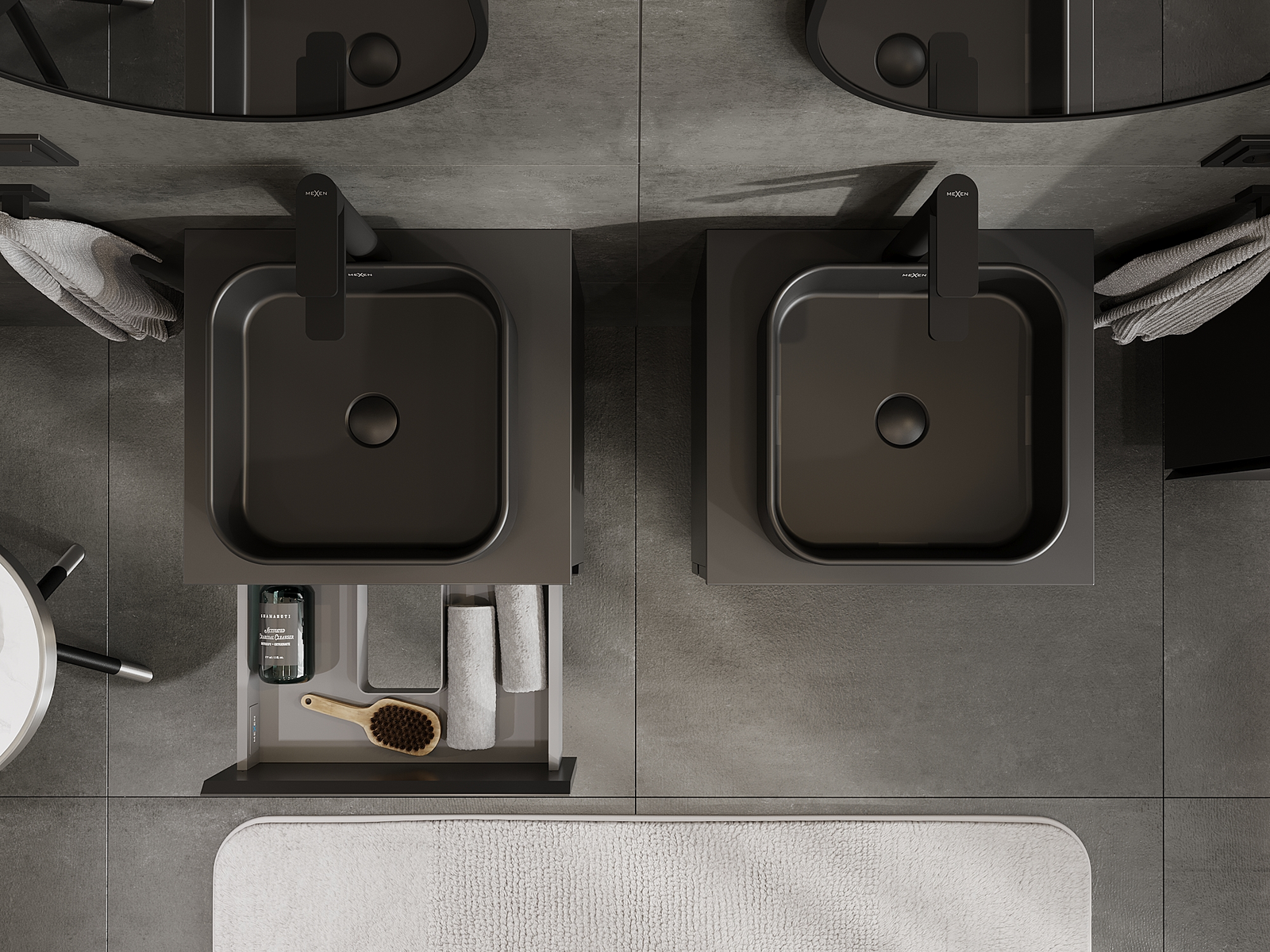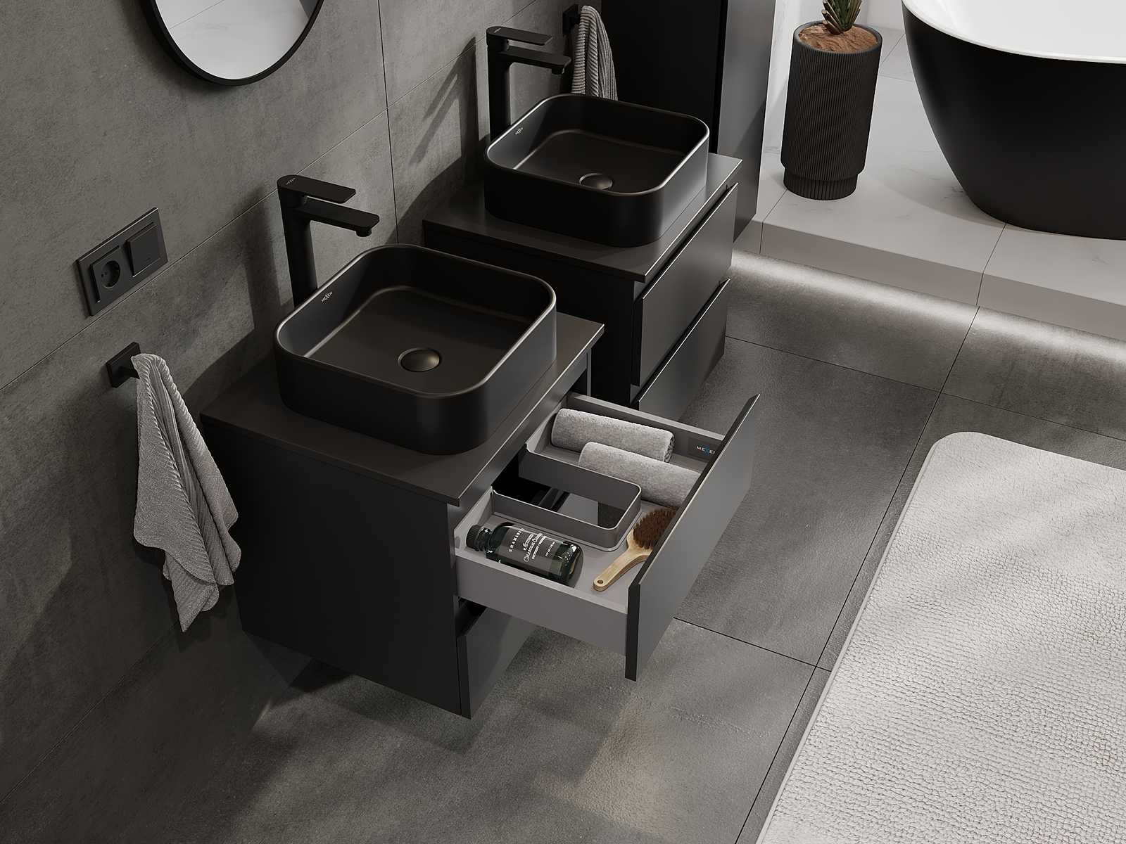 Mūsų moduliniai vonios baldai gali būti derinami tarpusavyje įvairiomis spalvų konfigūracijomis, leidžiant visiškai pritaikyti pagal asmeninius poreikius. Galima pasirinkti tiek atskirų elementų išvaizdą, tiek funkcijas, kas leidžia baldus pritaikyti pagal savo stiliaus ir naudojimo preferencijas.