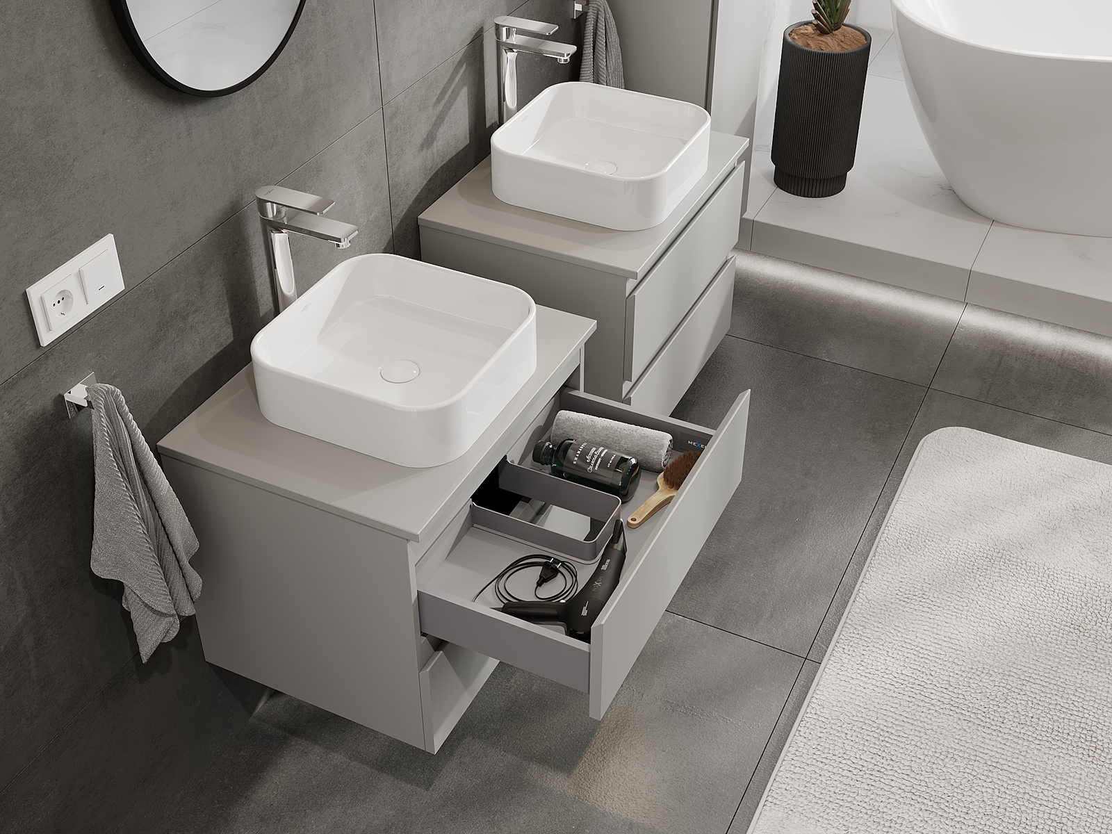 Mūsų moduliniai vonios baldai gali būti derinami tarpusavyje įvairiomis spalvų konfigūracijomis, leidžiant visiškai pritaikyti pagal asmeninius poreikius. Galima pasirinkti tiek atskirų elementų išvaizdą, tiek funkcijas, kas leidžia baldus pritaikyti pagal savo stiliaus ir naudojimo preferencijas.
