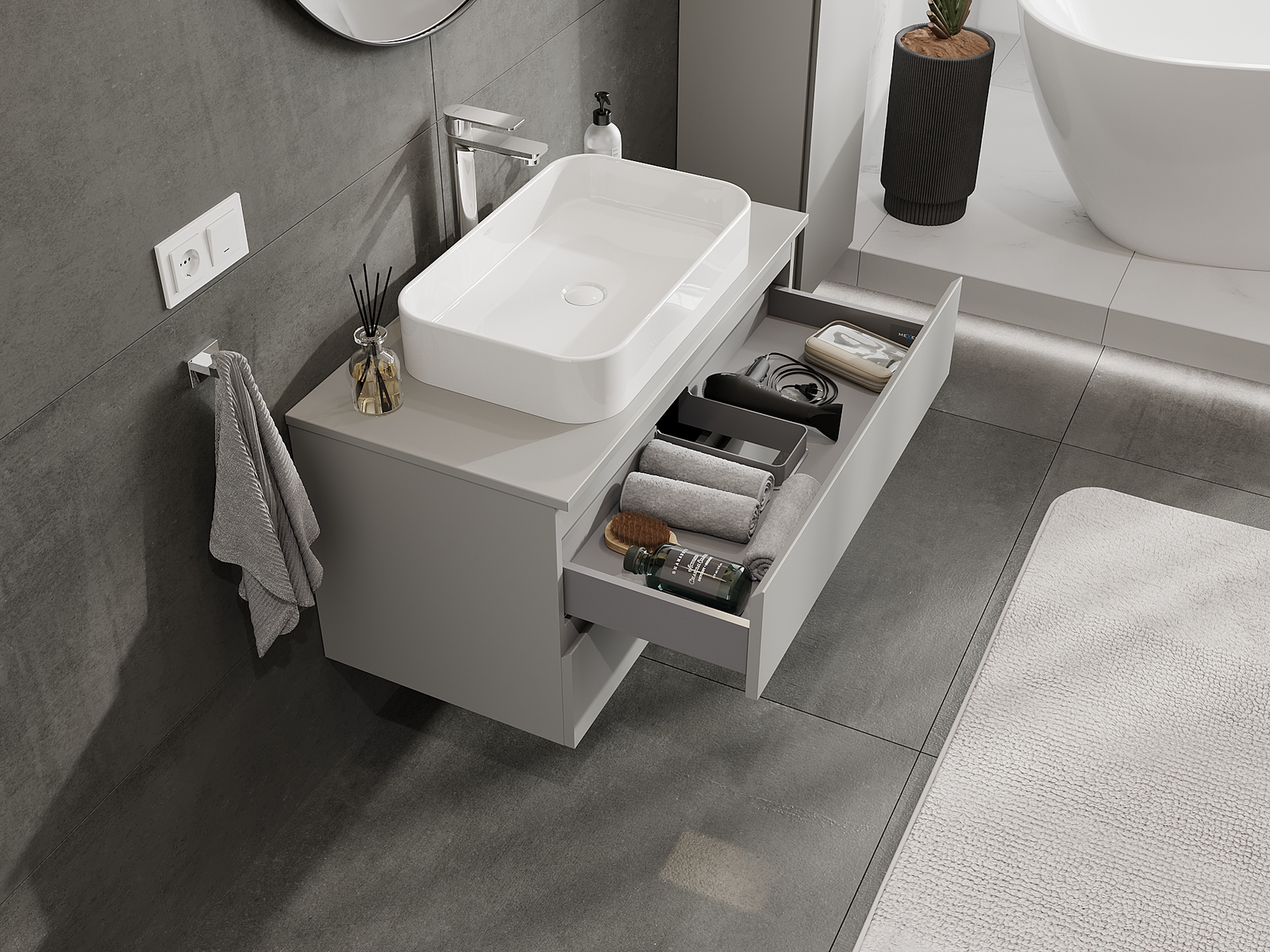 Mūsų moduliniai vonios baldai gali būti derinami tarpusavyje įvairiomis spalvų konfigūracijomis, leidžiant visiškai pritaikyti pagal asmeninius poreikius. Galima pasirinkti tiek atskirų elementų išvaizdą, tiek funkcijas, kas leidžia baldus pritaikyti pagal savo stiliaus ir naudojimo preferencijas.