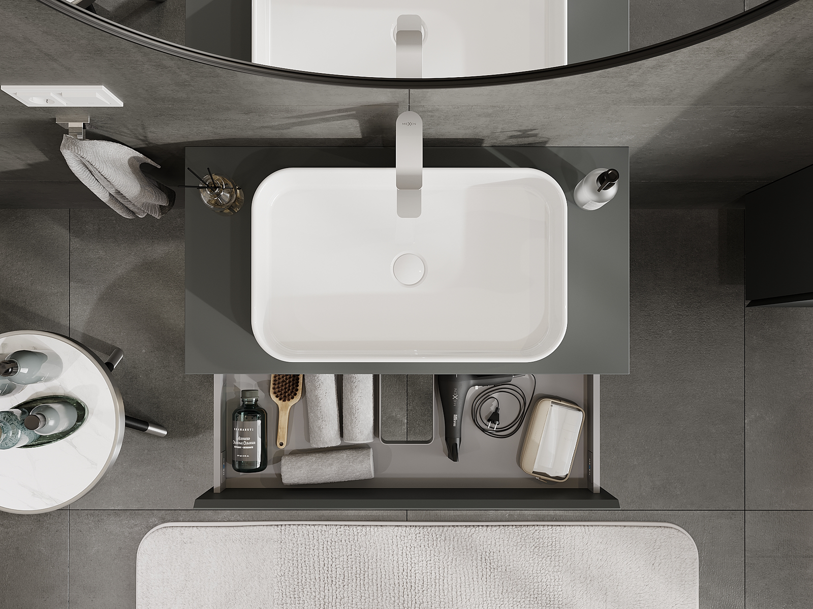 Mūsų moduliniai vonios baldai gali būti derinami tarpusavyje įvairiomis spalvų konfigūracijomis, leidžiant visiškai pritaikyti pagal asmeninius poreikius. Galima pasirinkti tiek atskirų elementų išvaizdą, tiek funkcijas, kas leidžia baldus pritaikyti pagal savo stiliaus ir naudojimo preferencijas.