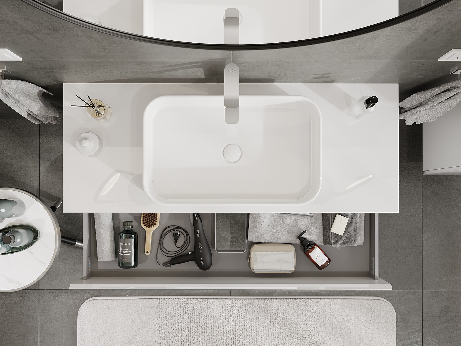 Mūsų moduliniai vonios baldai gali būti derinami tarpusavyje įvairiomis spalvų konfigūracijomis, leidžiant visiškai pritaikyti pagal asmeninius poreikius. Galima pasirinkti tiek atskirų elementų išvaizdą, tiek funkcijas, kas leidžia baldus pritaikyti pagal savo stiliaus ir naudojimo preferencijas.
