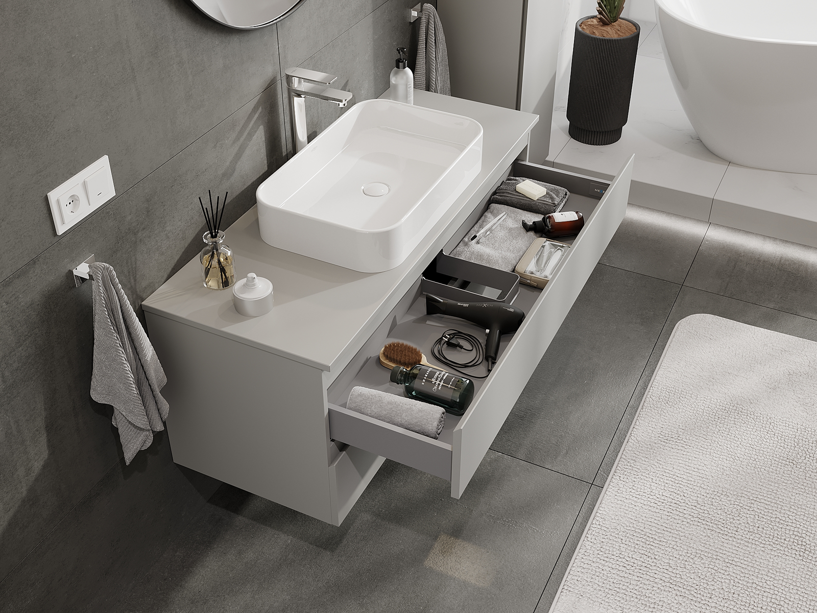 Dėl tvirtų medžiagų, preciziško atlikimo ir šiuolaikinių technologinių sprendimų, produktas užtikrina patogų naudojimą, atsparumą drėgmei ir temperatūros pokyčiams, taip pat elegantišką išvaizdą, kuri tinka įvairiems vonios kambario stiliams.