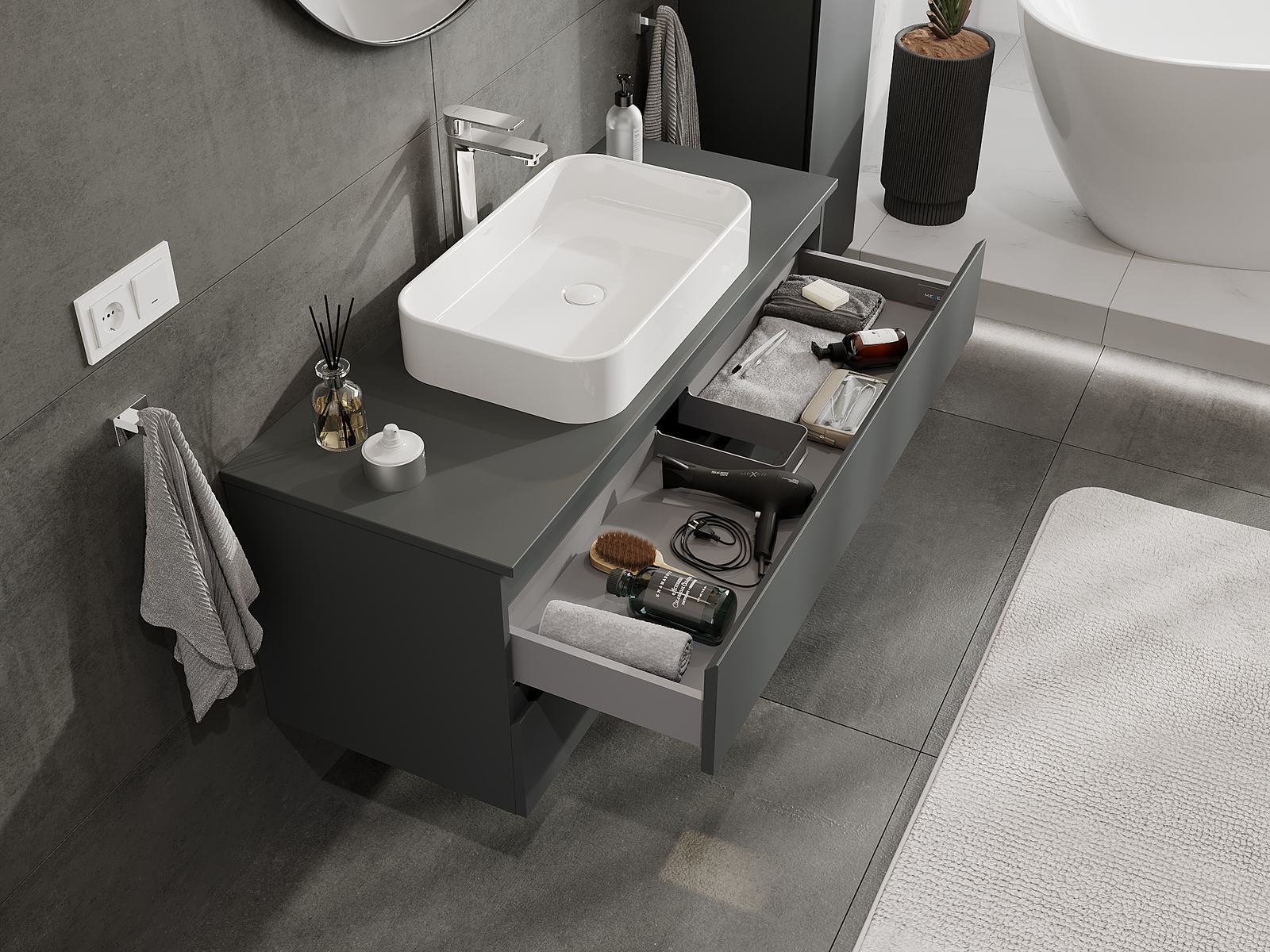 Mūsų moduliniai vonios baldai gali būti derinami tarpusavyje įvairiomis spalvų konfigūracijomis, leidžiant visiškai pritaikyti pagal asmeninius poreikius. Galima pasirinkti tiek atskirų elementų išvaizdą, tiek funkcijas, kas leidžia baldus pritaikyti pagal savo stiliaus ir naudojimo preferencijas.