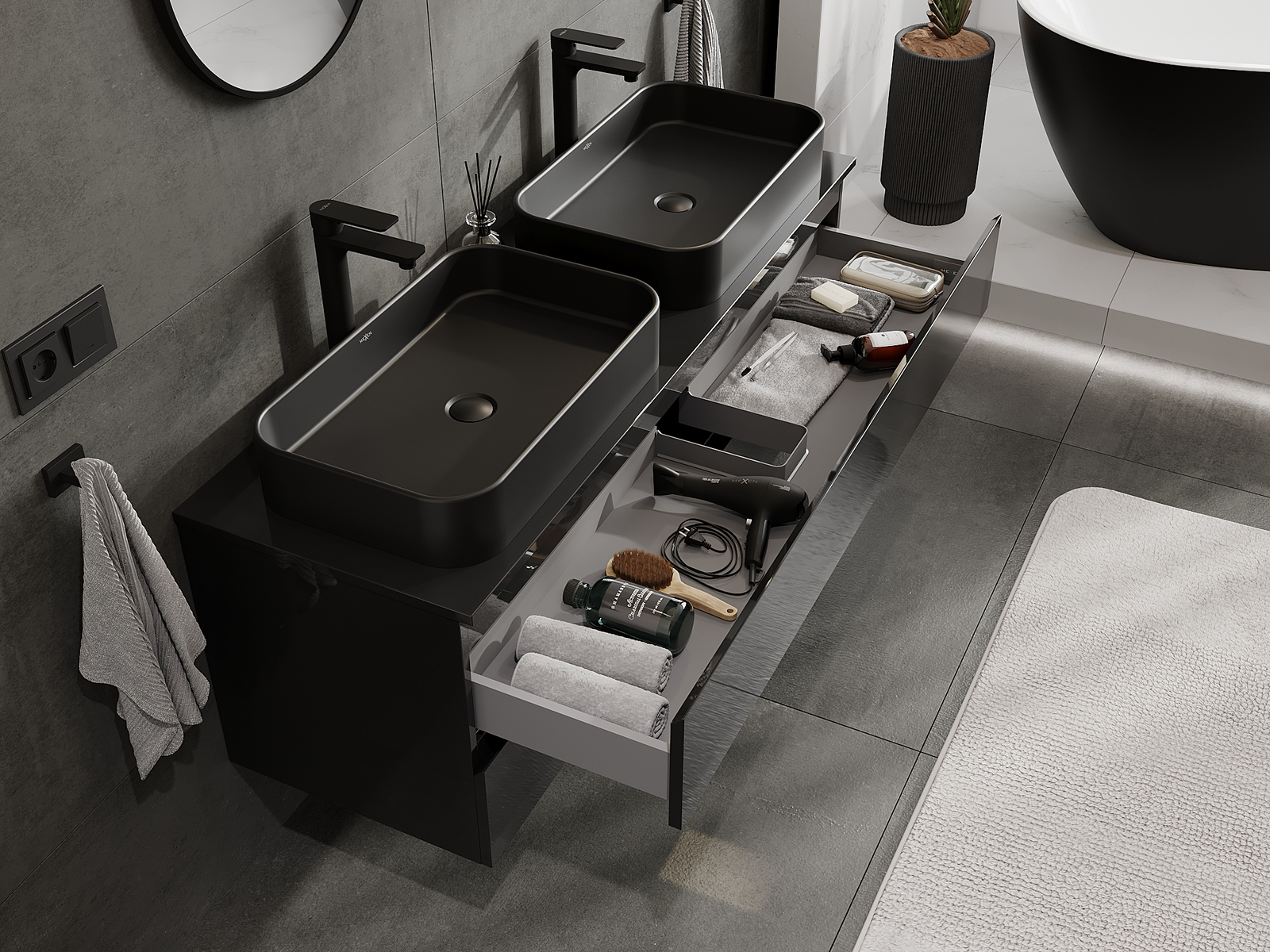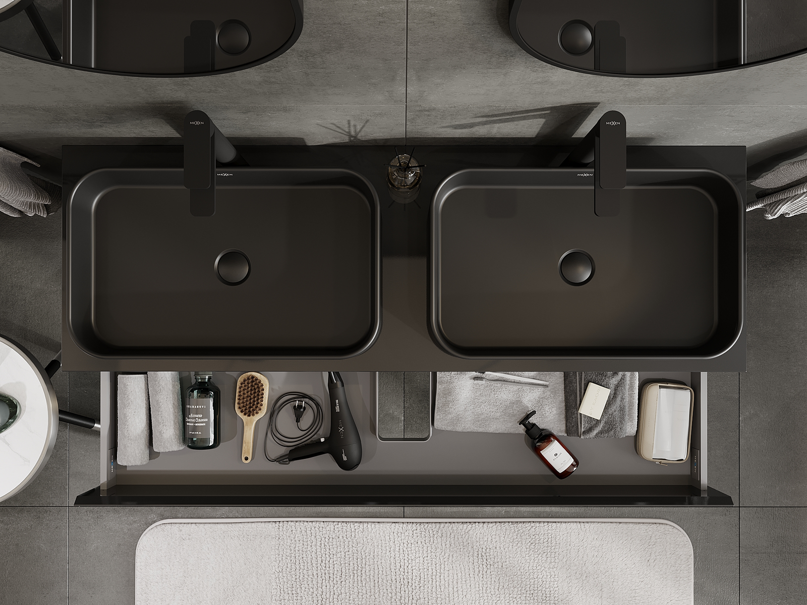 Mūsų moduliniai vonios baldai gali būti derinami tarpusavyje įvairiomis spalvų konfigūracijomis, leidžiant visiškai pritaikyti pagal asmeninius poreikius. Galima pasirinkti tiek atskirų elementų išvaizdą, tiek funkcijas, kas leidžia baldus pritaikyti pagal savo stiliaus ir naudojimo preferencijas.