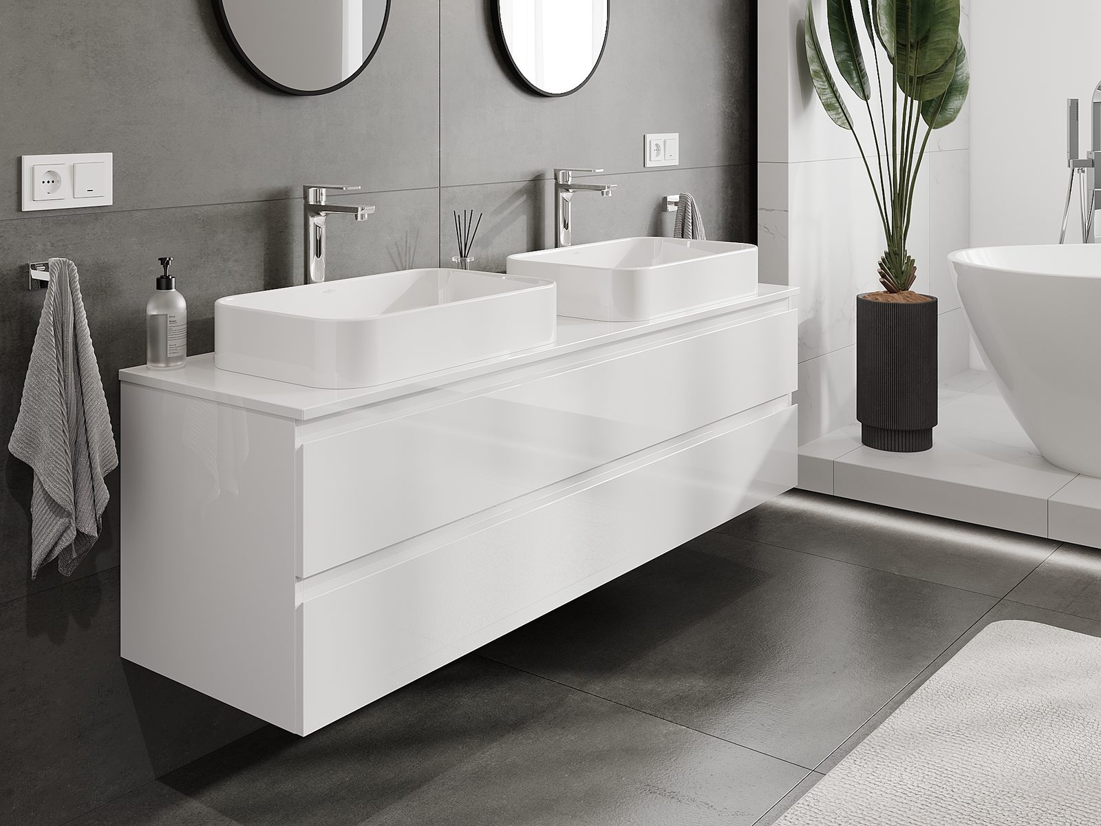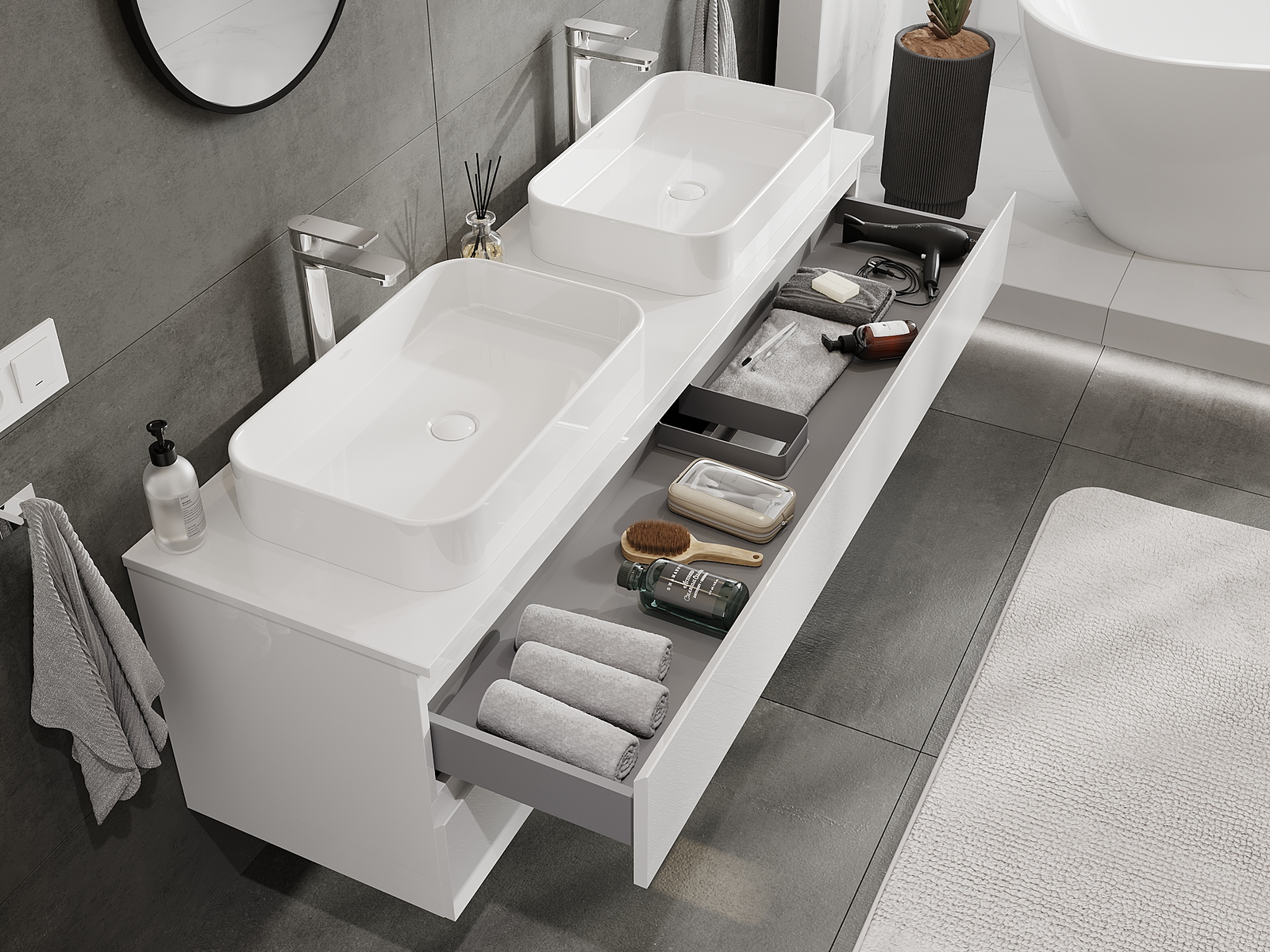 Mūsų moduliniai vonios baldai gali būti derinami tarpusavyje įvairiomis spalvų konfigūracijomis, leidžiant visiškai pritaikyti pagal asmeninius poreikius. Galima pasirinkti tiek atskirų elementų išvaizdą, tiek funkcijas, kas leidžia baldus pritaikyti pagal savo stiliaus ir naudojimo preferencijas.