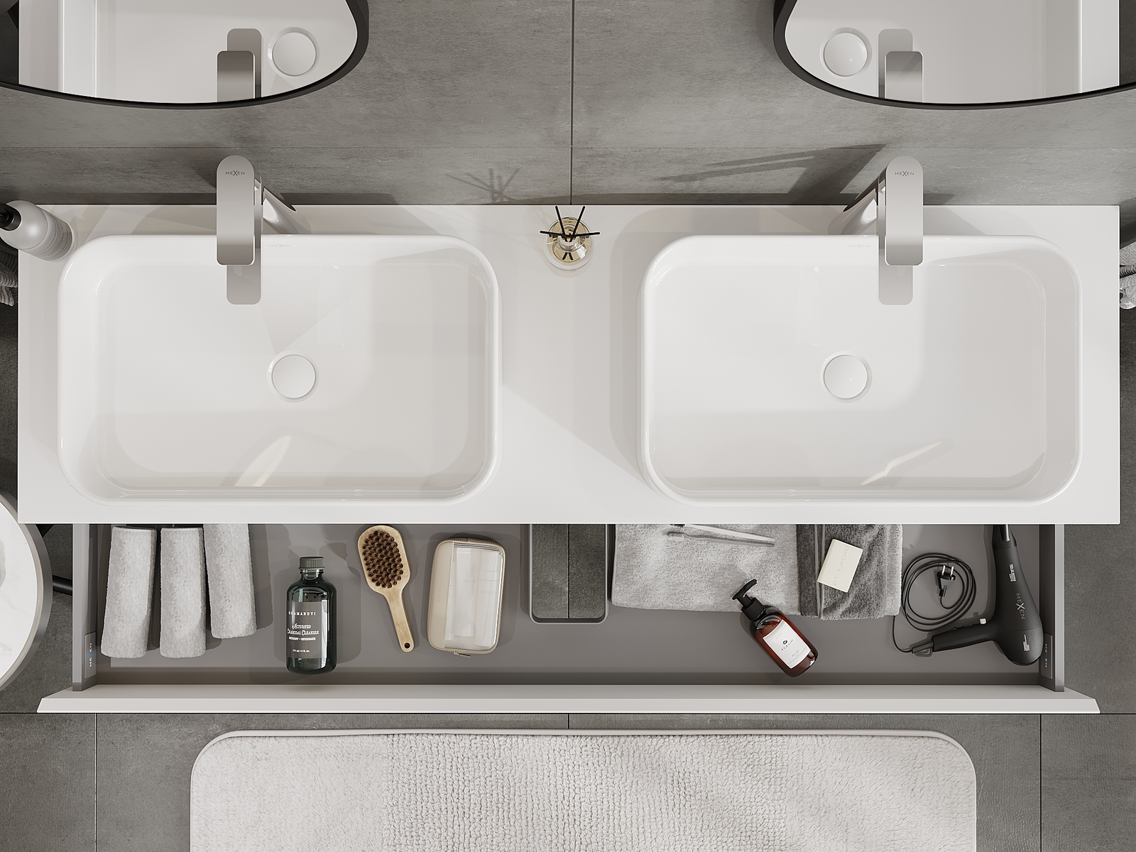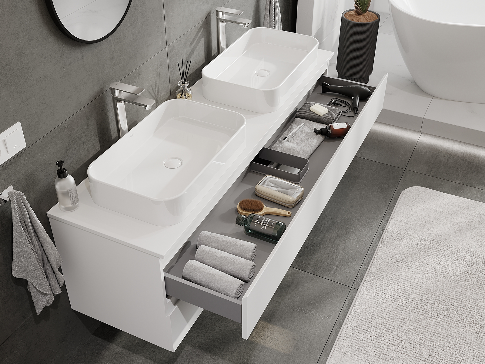 Mūsų moduliniai vonios baldai gali būti derinami tarpusavyje įvairiomis spalvų konfigūracijomis, leidžiant visiškai pritaikyti pagal asmeninius poreikius. Galima pasirinkti tiek atskirų elementų išvaizdą, tiek funkcijas, kas leidžia baldus pritaikyti pagal savo stiliaus ir naudojimo preferencijas.