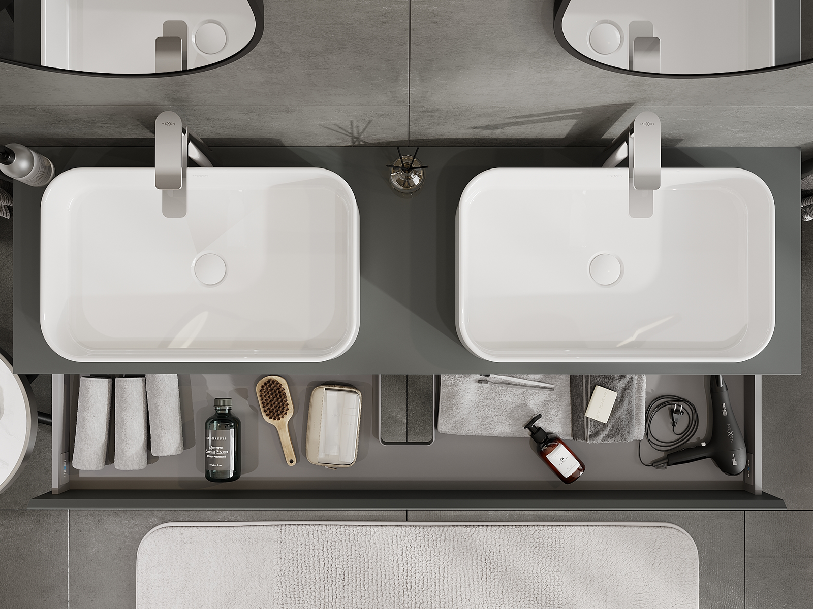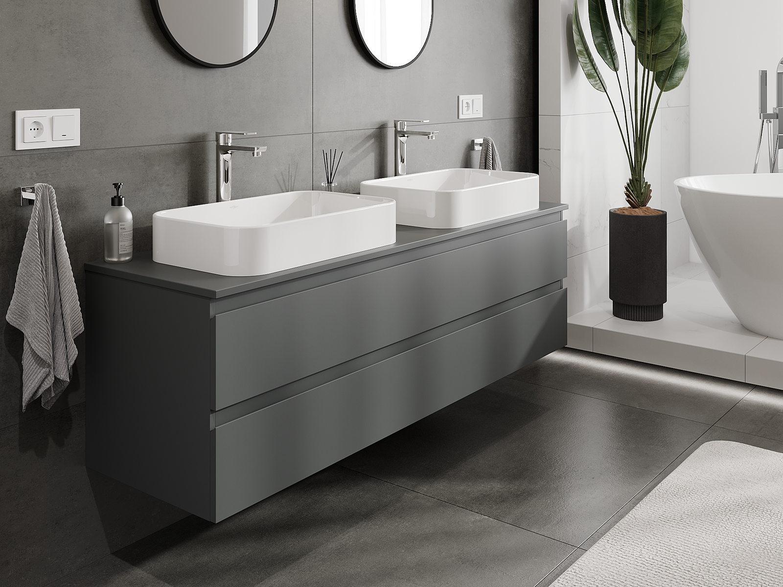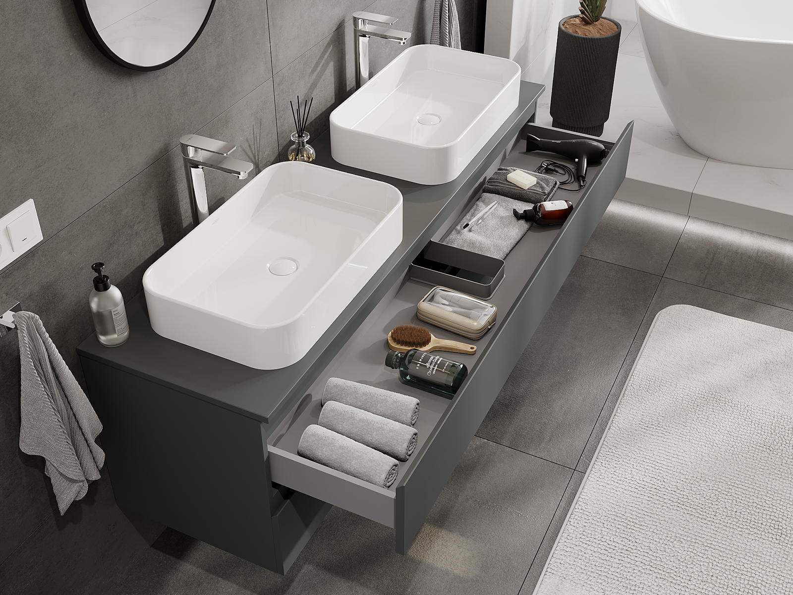 Mūsų moduliniai vonios baldai gali būti derinami tarpusavyje įvairiomis spalvų konfigūracijomis, leidžiant visiškai pritaikyti pagal asmeninius poreikius. Galima pasirinkti tiek atskirų elementų išvaizdą, tiek funkcijas, kas leidžia baldus pritaikyti pagal savo stiliaus ir naudojimo preferencijas.