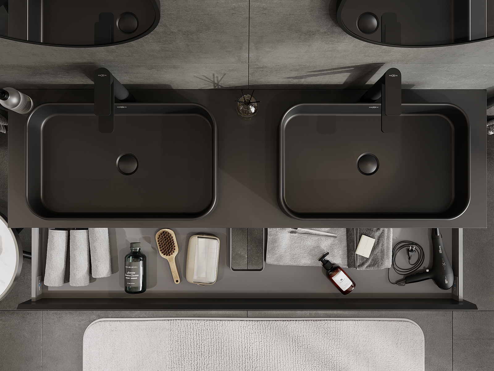 Mūsų moduliniai vonios baldai gali būti derinami tarpusavyje įvairiomis spalvų konfigūracijomis, leidžiant visiškai pritaikyti pagal asmeninius poreikius. Galima pasirinkti tiek atskirų elementų išvaizdą, tiek funkcijas, kas leidžia baldus pritaikyti pagal savo stiliaus ir naudojimo preferencijas.