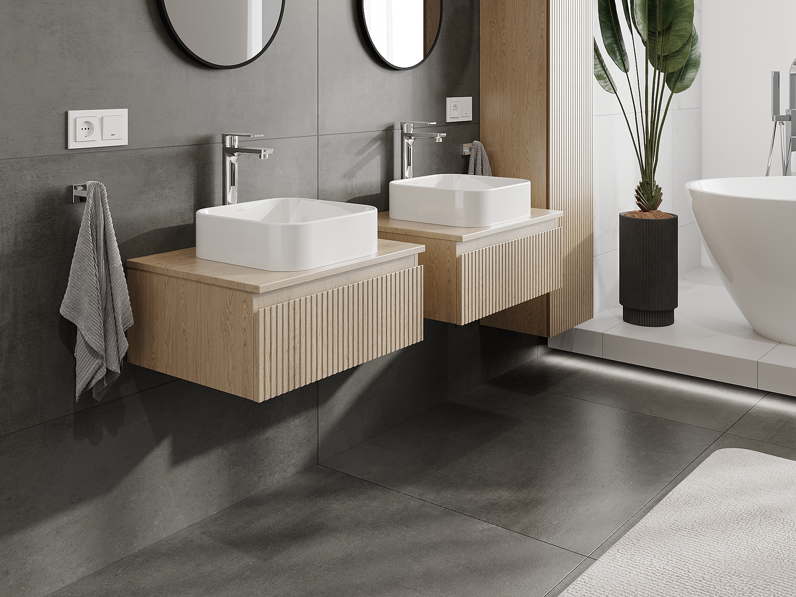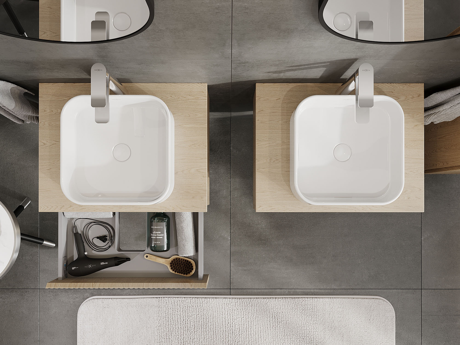 Mūsų moduliniai vonios baldai gali būti derinami tarpusavyje įvairiomis spalvų konfigūracijomis, leidžiant visiškai pritaikyti pagal asmeninius poreikius. Galima pasirinkti tiek atskirų elementų išvaizdą, tiek funkcijas, kas leidžia baldus pritaikyti pagal savo stiliaus ir naudojimo preferencijas.