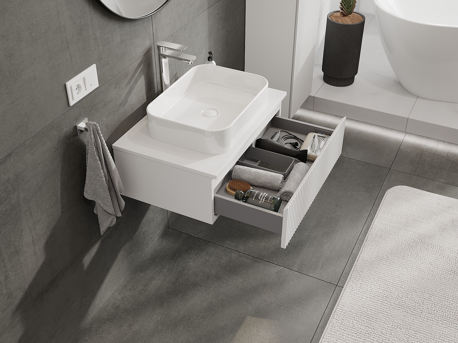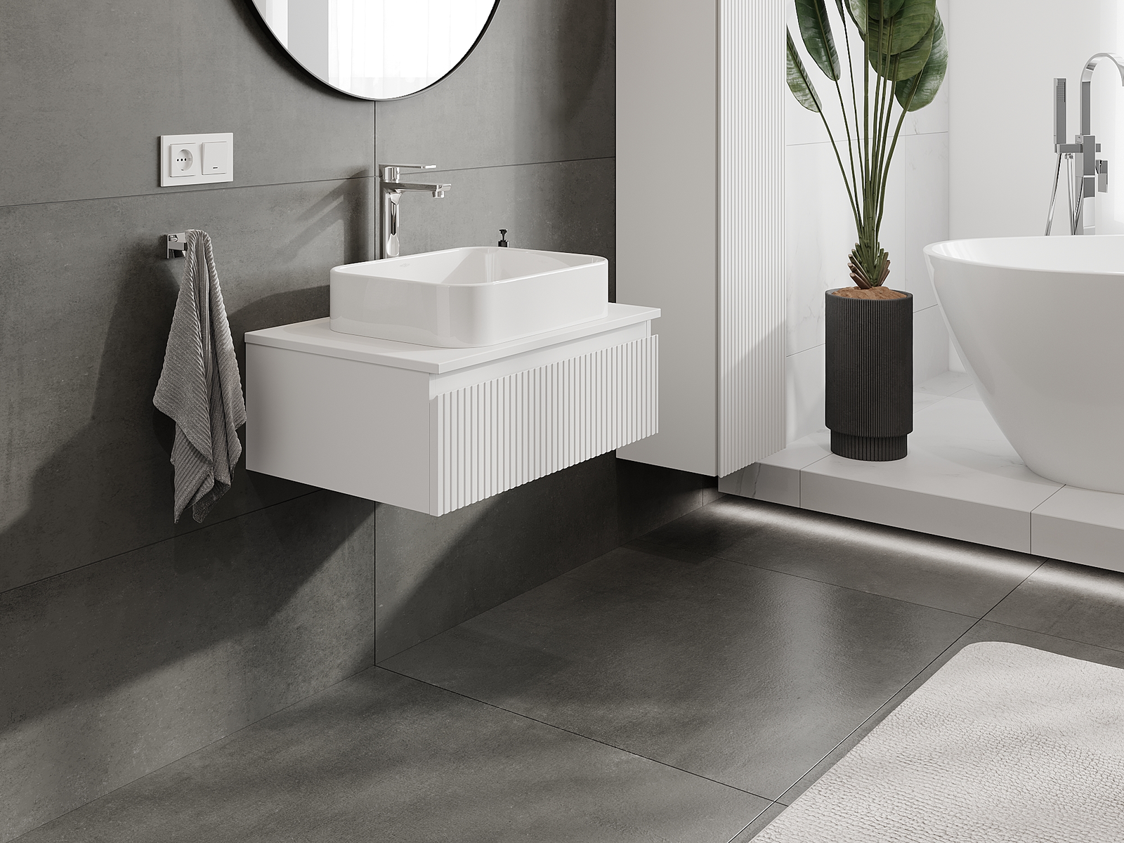 Mūsų moduliniai vonios baldai gali būti derinami tarpusavyje įvairiomis spalvų konfigūracijomis, leidžiant visiškai pritaikyti pagal asmeninius poreikius. Galima pasirinkti tiek atskirų elementų išvaizdą, tiek funkcijas, kas leidžia baldus pritaikyti pagal savo stiliaus ir naudojimo preferencijas.