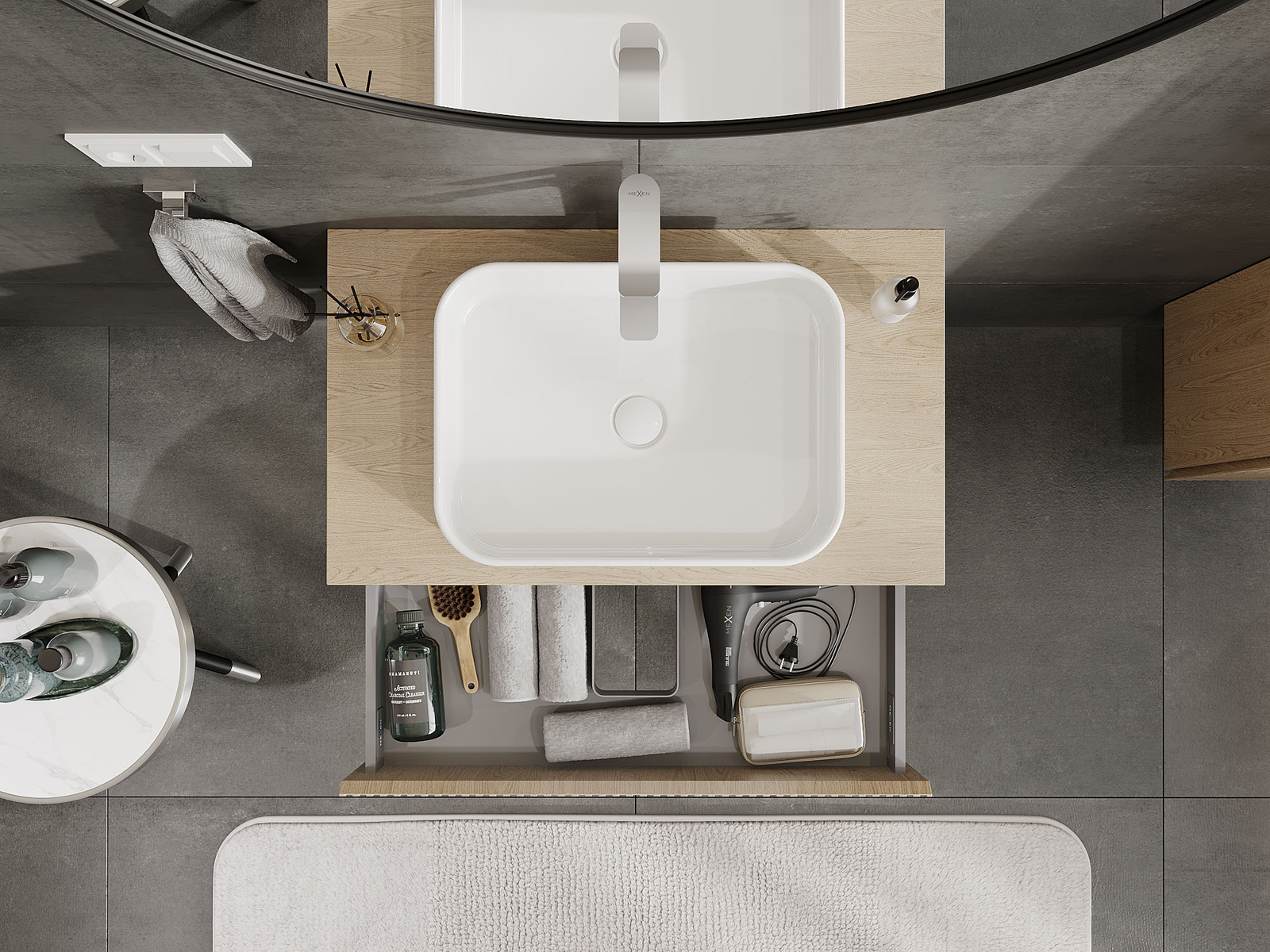 Mūsų moduliniai vonios baldai gali būti derinami tarpusavyje įvairiomis spalvų konfigūracijomis, leidžiant visiškai pritaikyti pagal asmeninius poreikius. Galima pasirinkti tiek atskirų elementų išvaizdą, tiek funkcijas, kas leidžia baldus pritaikyti pagal savo stiliaus ir naudojimo preferencijas.