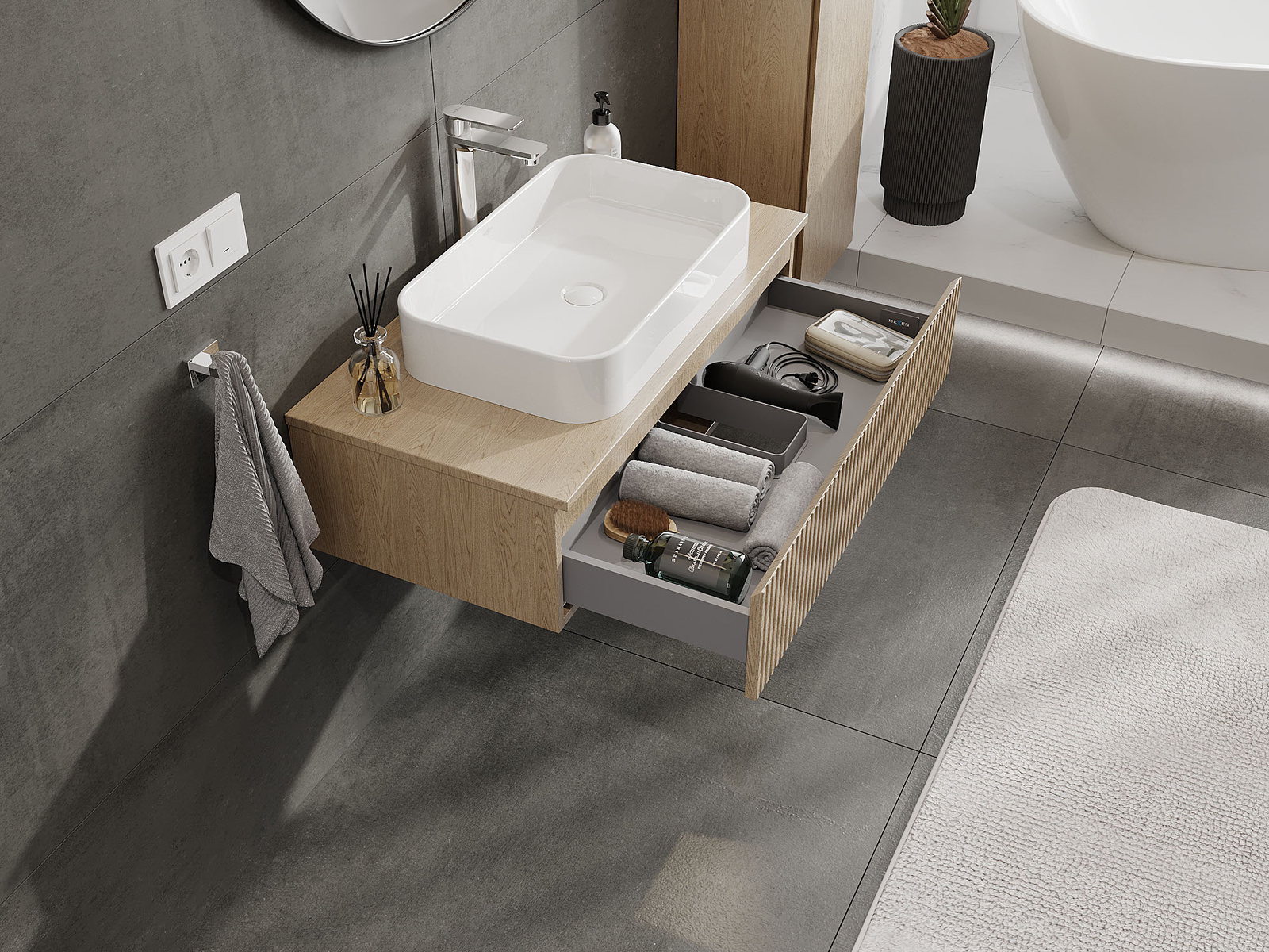 Mūsų moduliniai vonios baldai gali būti derinami tarpusavyje įvairiomis spalvų konfigūracijomis, leidžiant visiškai pritaikyti pagal asmeninius poreikius. Galima pasirinkti tiek atskirų elementų išvaizdą, tiek funkcijas, kas leidžia baldus pritaikyti pagal savo stiliaus ir naudojimo preferencijas.