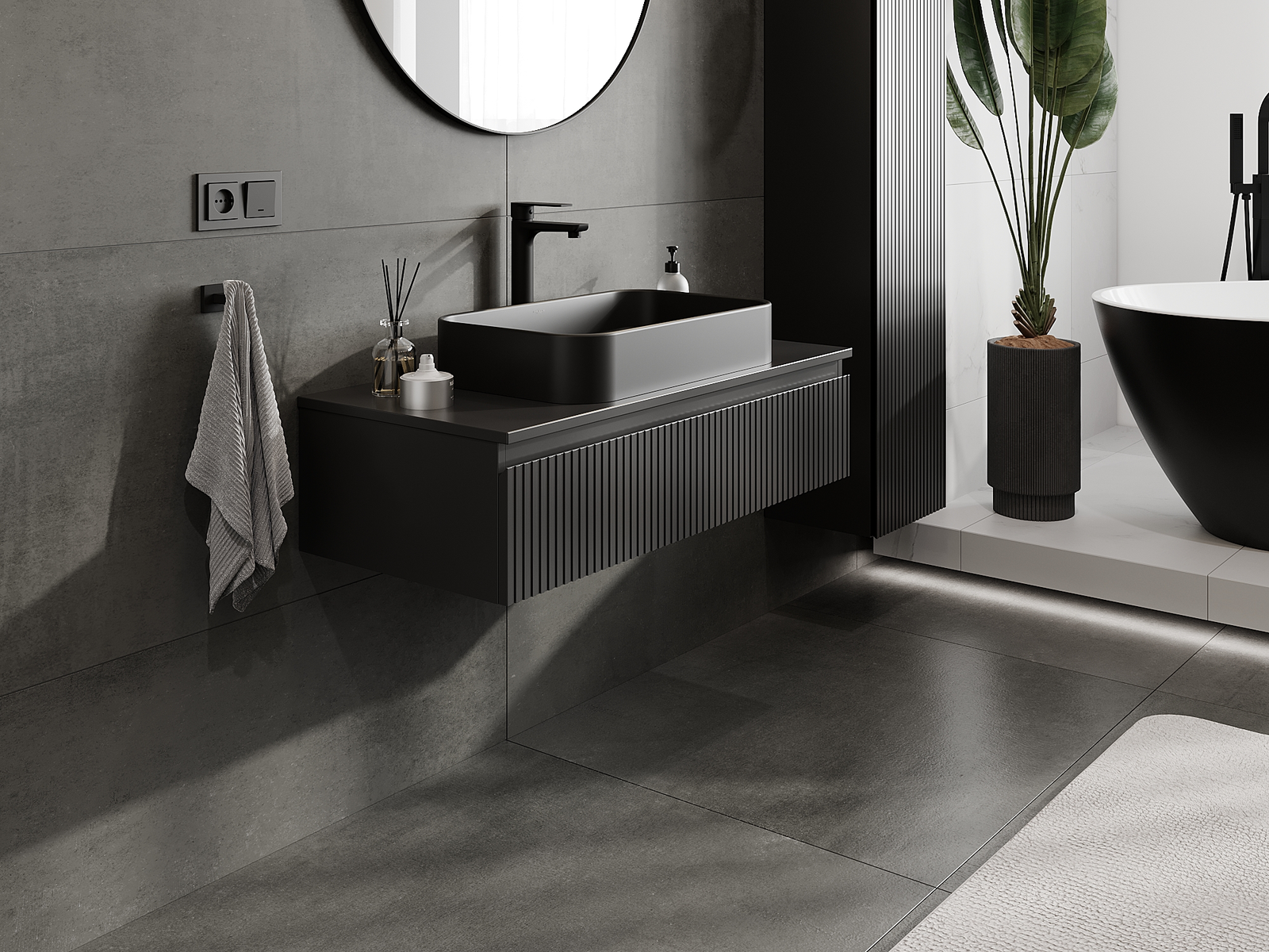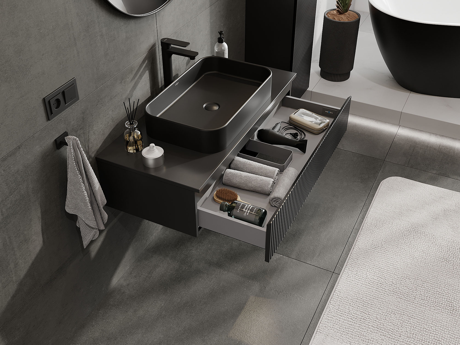 Mexen Rivel vonios kambario spintele po praustuvu 100 cm, 1 stalčius, grioveliais, juoda matinė - 91A20-10023-1-BF71