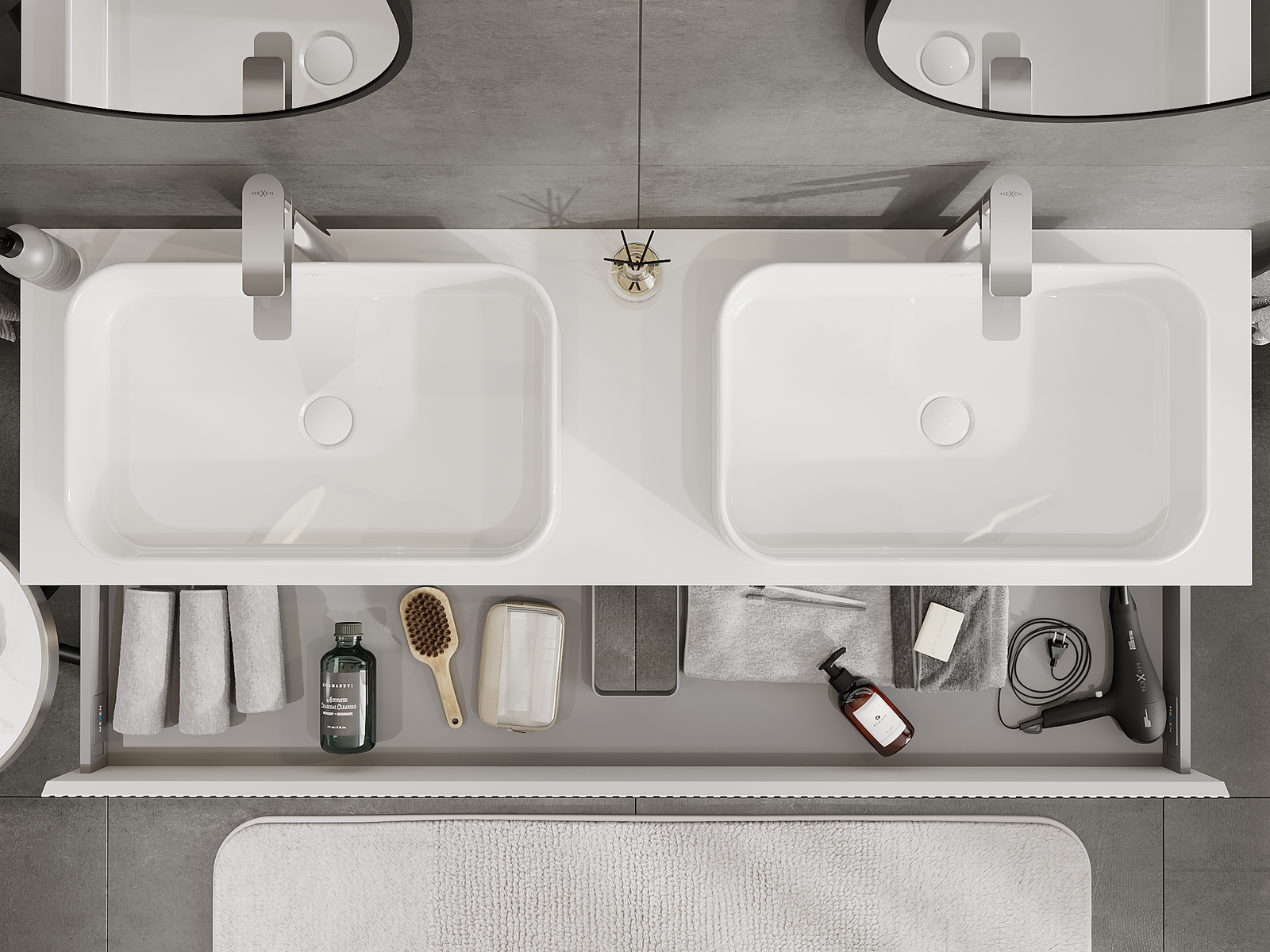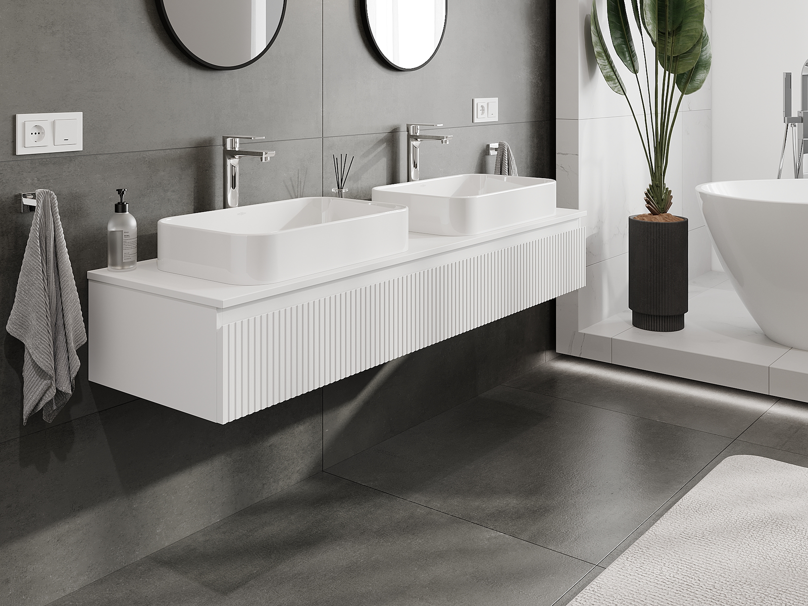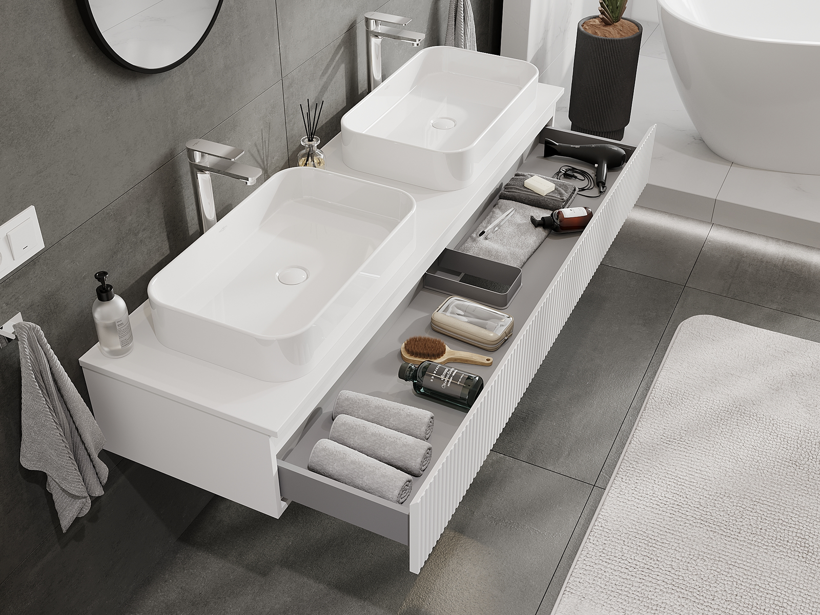 Mūsų moduliniai vonios baldai gali būti derinami tarpusavyje įvairiomis spalvų konfigūracijomis, leidžiant visiškai pritaikyti pagal asmeninius poreikius. Galima pasirinkti tiek atskirų elementų išvaizdą, tiek funkcijas, kas leidžia baldus pritaikyti pagal savo stiliaus ir naudojimo preferencijas.