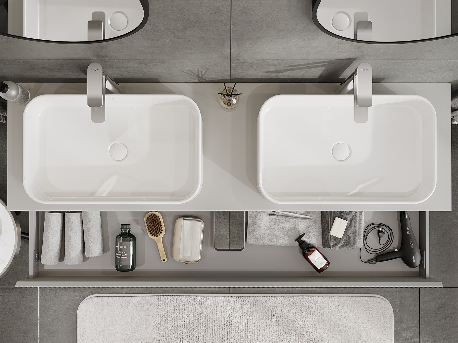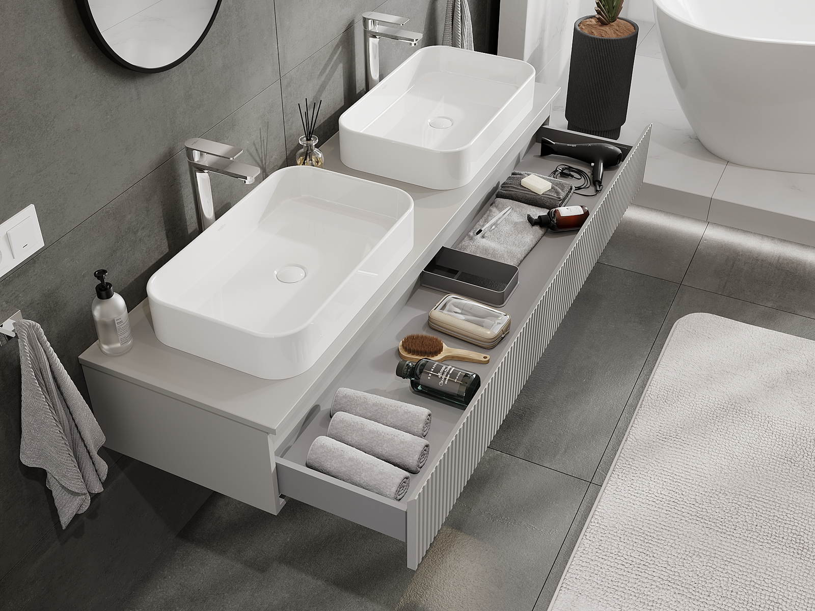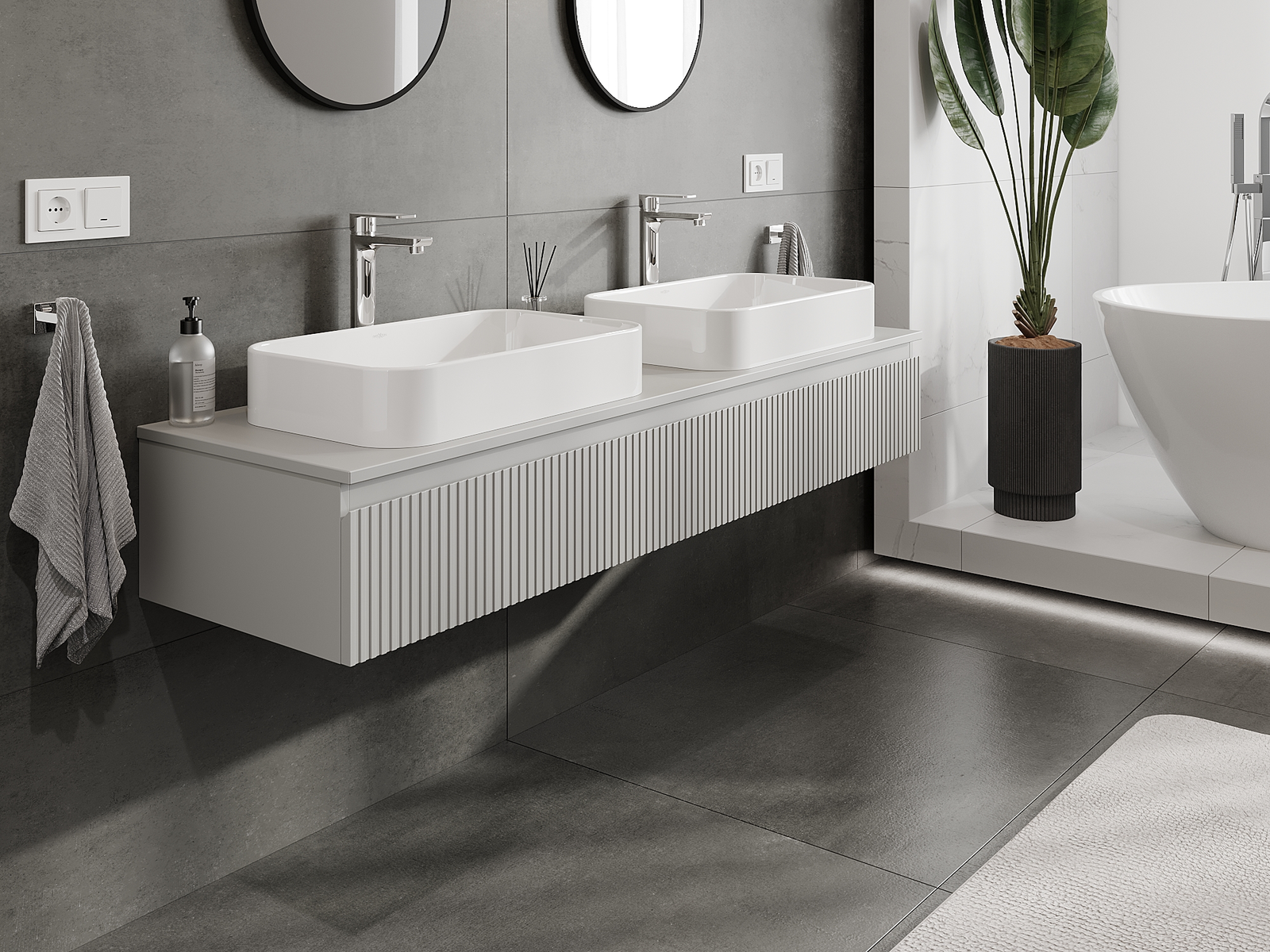 Mūsų moduliniai vonios baldai gali būti derinami tarpusavyje įvairiomis spalvų konfigūracijomis, leidžiant visiškai pritaikyti pagal asmeninius poreikius. Galima pasirinkti tiek atskirų elementų išvaizdą, tiek funkcijas, kas leidžia baldus pritaikyti pagal savo stiliaus ir naudojimo preferencijas.