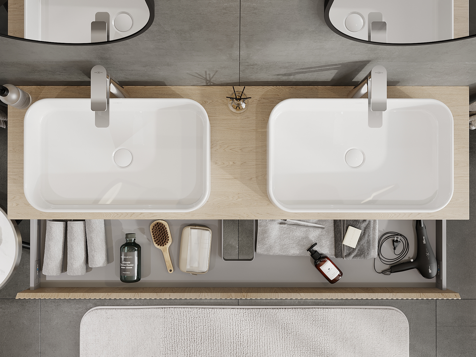 Mūsų moduliniai vonios baldai gali būti derinami tarpusavyje įvairiomis spalvų konfigūracijomis, leidžiant visiškai pritaikyti pagal asmeninius poreikius. Galima pasirinkti tiek atskirų elementų išvaizdą, tiek funkcijas, kas leidžia baldus pritaikyti pagal savo stiliaus ir naudojimo preferencijas.