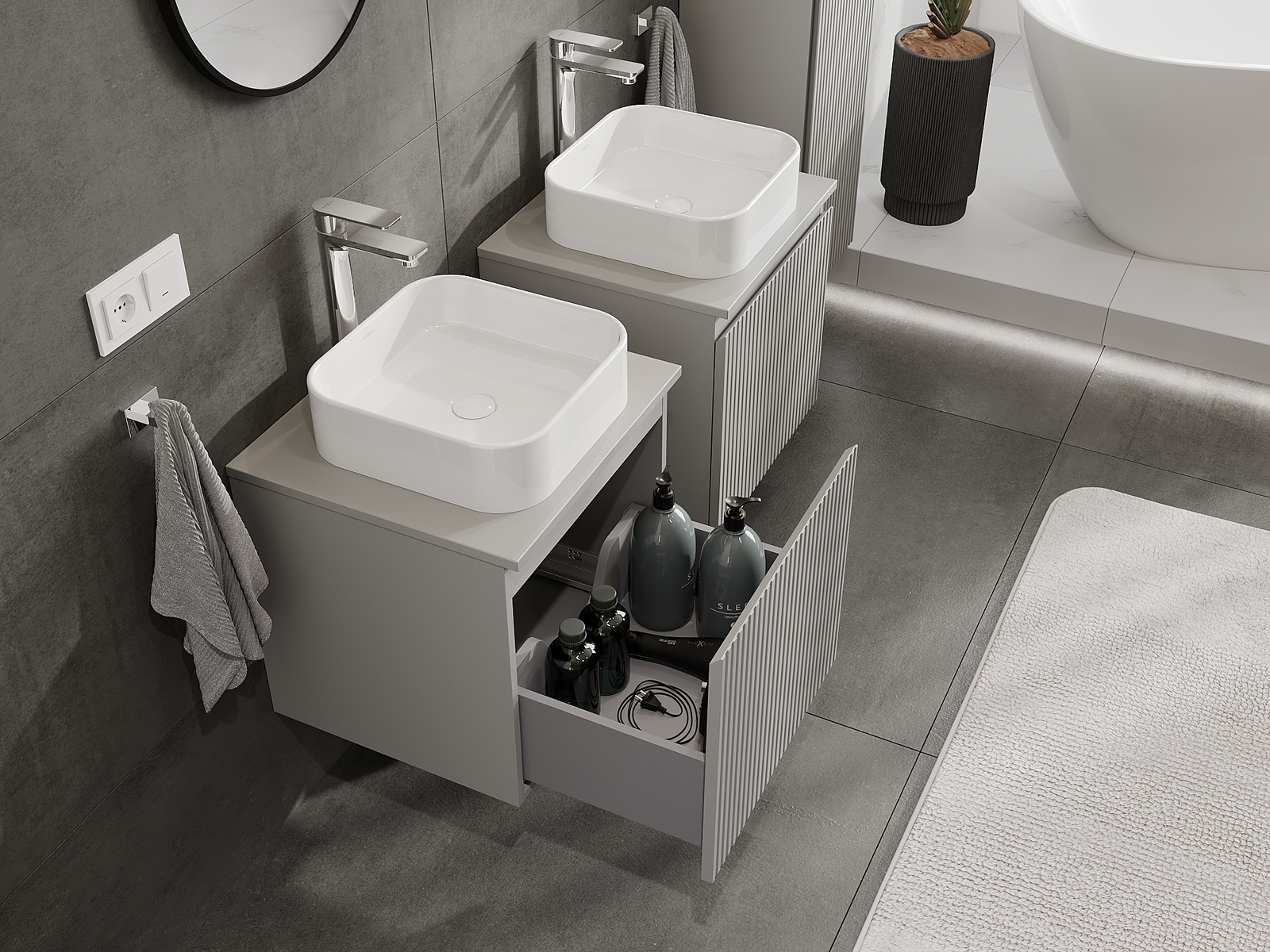 Mūsų moduliniai vonios baldai gali būti derinami tarpusavyje įvairiomis spalvų konfigūracijomis, leidžiant visiškai pritaikyti pagal asmeninius poreikius. Galima pasirinkti tiek atskirų elementų išvaizdą, tiek funkcijas, kas leidžia baldus pritaikyti pagal savo stiliaus ir naudojimo preferencijas.