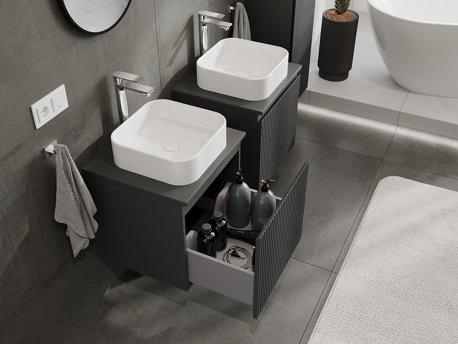 Mūsų moduliniai vonios baldai gali būti derinami tarpusavyje įvairiomis spalvų konfigūracijomis, leidžiant visiškai pritaikyti pagal asmeninius poreikius. Galima pasirinkti tiek atskirų elementų išvaizdą, tiek funkcijas, kas leidžia baldus pritaikyti pagal savo stiliaus ir naudojimo preferencijas.