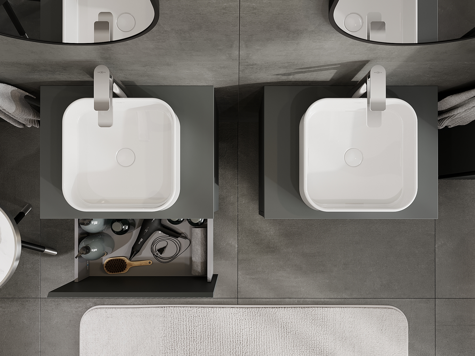 Mūsų moduliniai vonios baldai gali būti derinami tarpusavyje įvairiomis spalvų konfigūracijomis, leidžiant visiškai pritaikyti pagal asmeninius poreikius. Galima pasirinkti tiek atskirų elementų išvaizdą, tiek funkcijas, kas leidžia baldus pritaikyti pagal savo stiliaus ir naudojimo preferencijas.