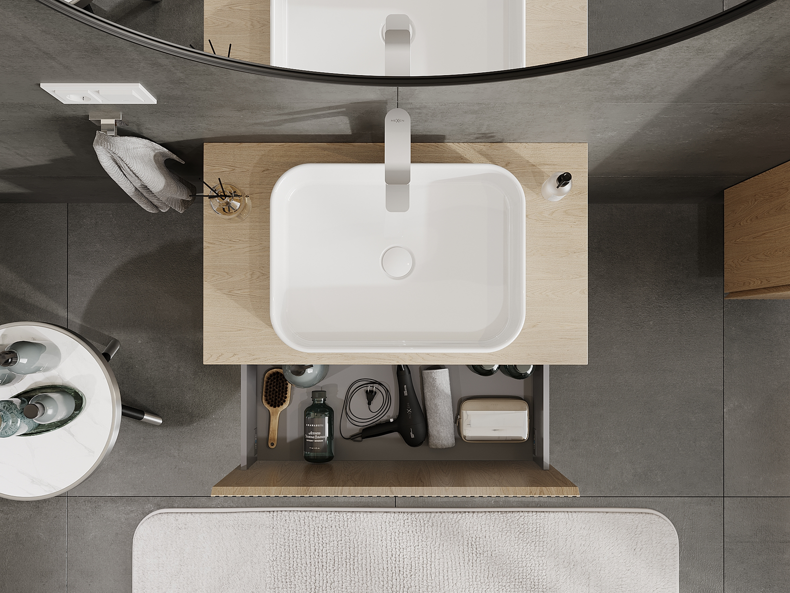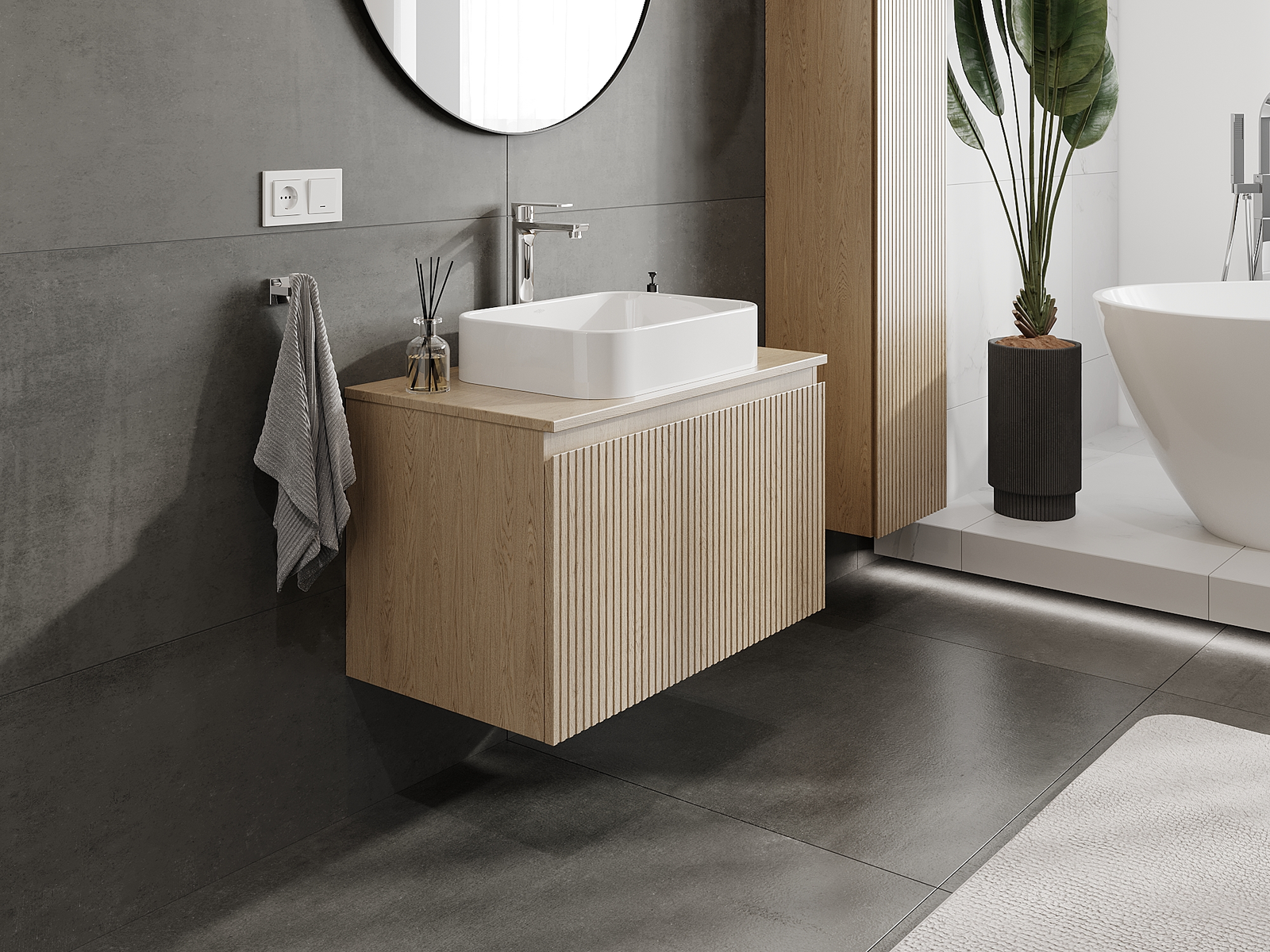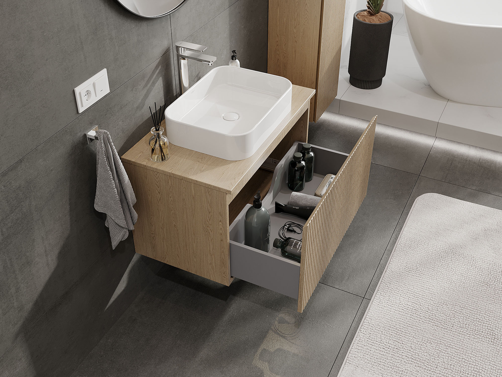 Mūsų moduliniai vonios baldai gali būti derinami tarpusavyje įvairiomis spalvų konfigūracijomis, leidžiant visiškai pritaikyti pagal asmeninius poreikius. Galima pasirinkti tiek atskirų elementų išvaizdą, tiek funkcijas, kas leidžia baldus pritaikyti pagal savo stiliaus ir naudojimo preferencijas.