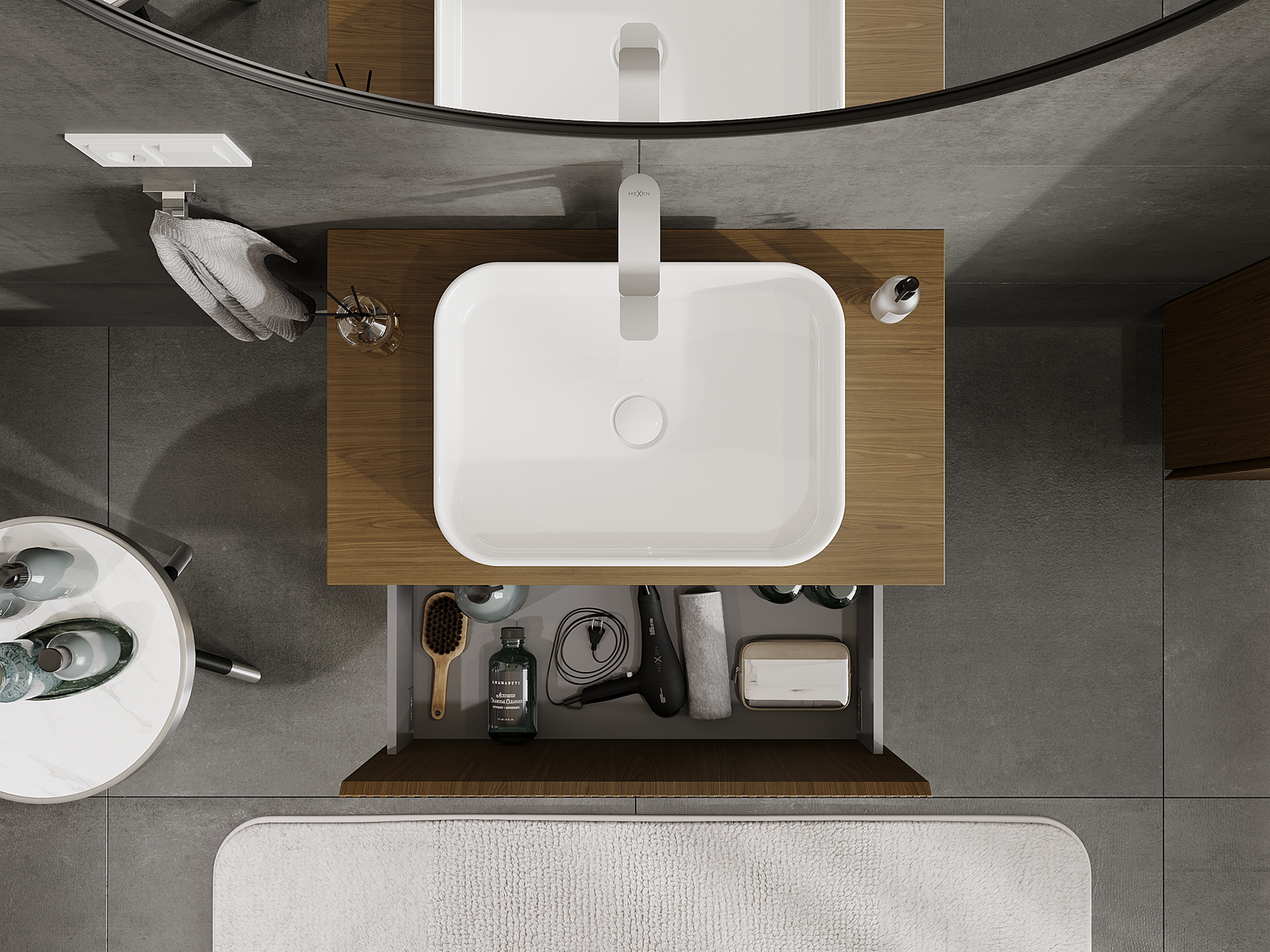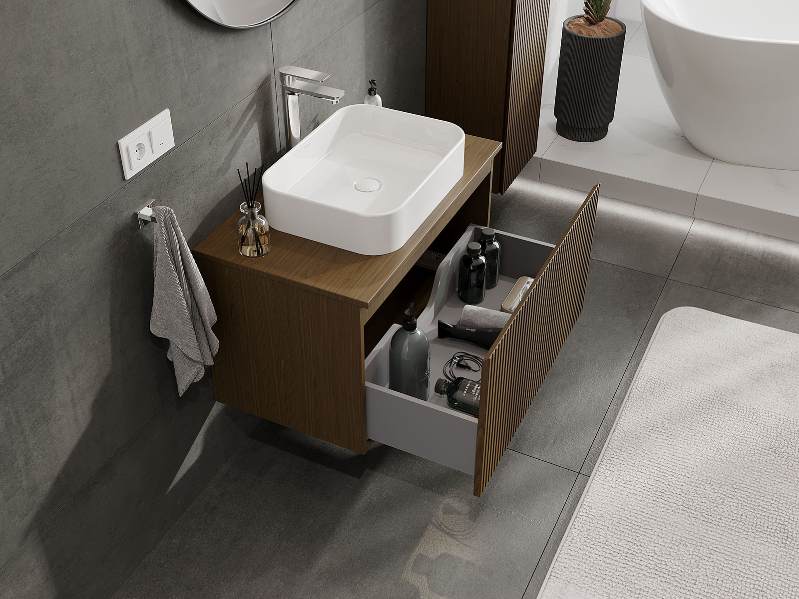 Mūsų moduliniai vonios baldai gali būti derinami tarpusavyje įvairiomis spalvų konfigūracijomis, leidžiant visiškai pritaikyti pagal asmeninius poreikius. Galima pasirinkti tiek atskirų elementų išvaizdą, tiek funkcijas, kas leidžia baldus pritaikyti pagal savo stiliaus ir naudojimo preferencijas.