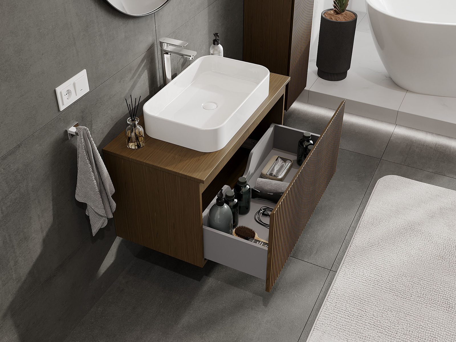 Mūsų moduliniai vonios baldai gali būti derinami tarpusavyje įvairiomis spalvų konfigūracijomis, leidžiant visiškai pritaikyti pagal asmeninius poreikius. Galima pasirinkti tiek atskirų elementų išvaizdą, tiek funkcijas, kas leidžia baldus pritaikyti pagal savo stiliaus ir naudojimo preferencijas.