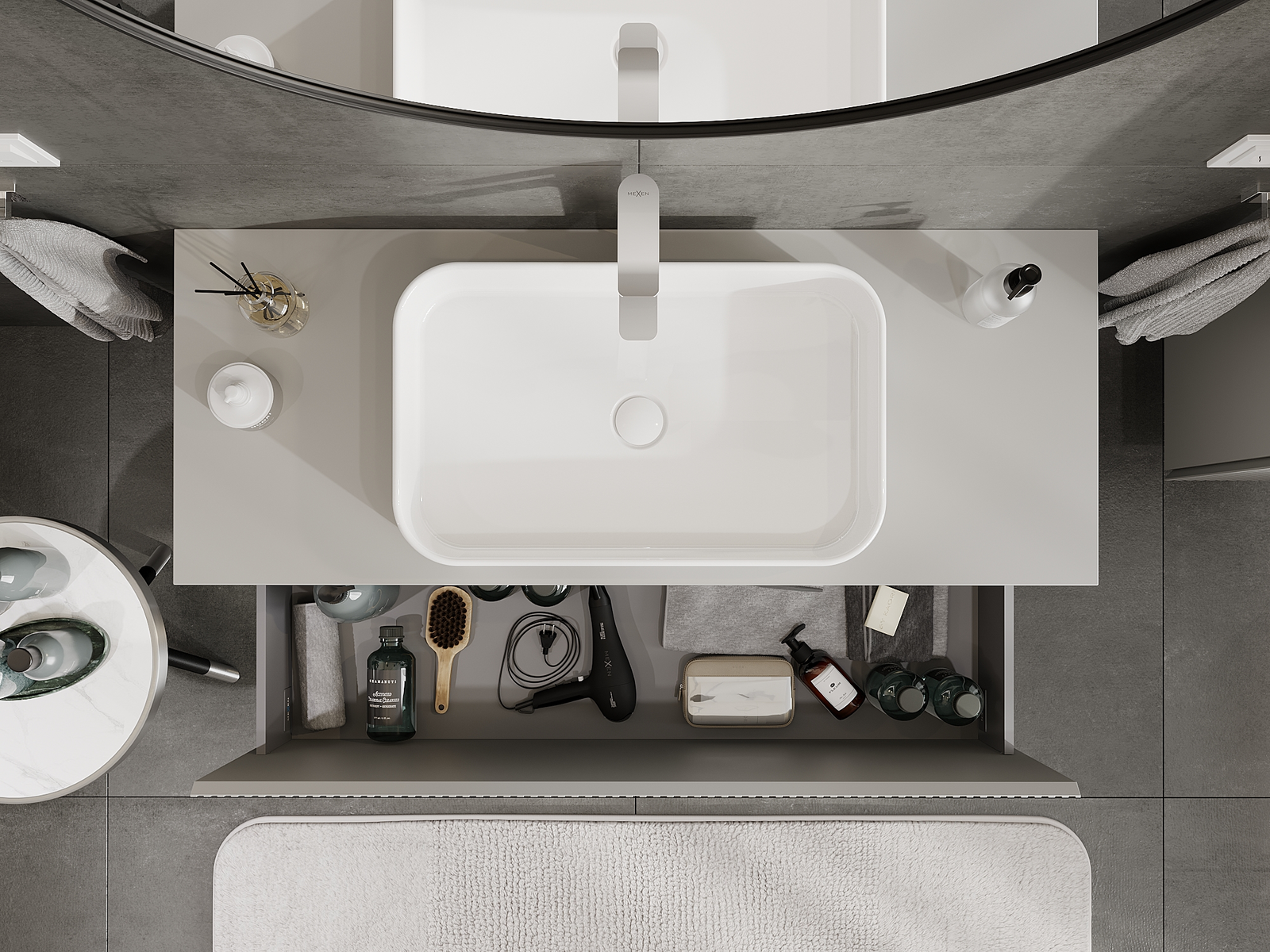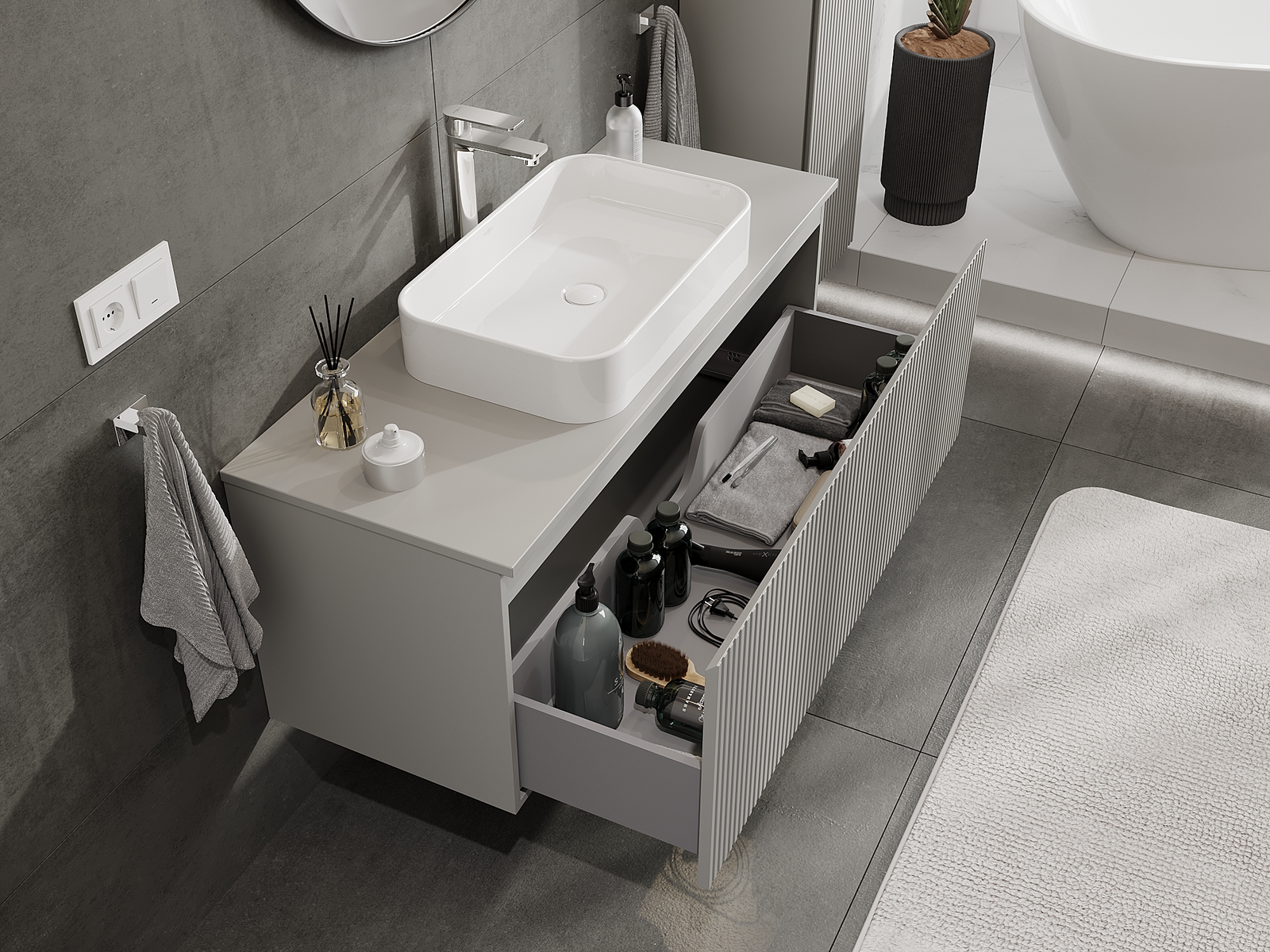 Mūsų moduliniai vonios baldai gali būti derinami tarpusavyje įvairiomis spalvų konfigūracijomis, leidžiant visiškai pritaikyti pagal asmeninius poreikius. Galima pasirinkti tiek atskirų elementų išvaizdą, tiek funkcijas, kas leidžia baldus pritaikyti pagal savo stiliaus ir naudojimo preferencijas.
