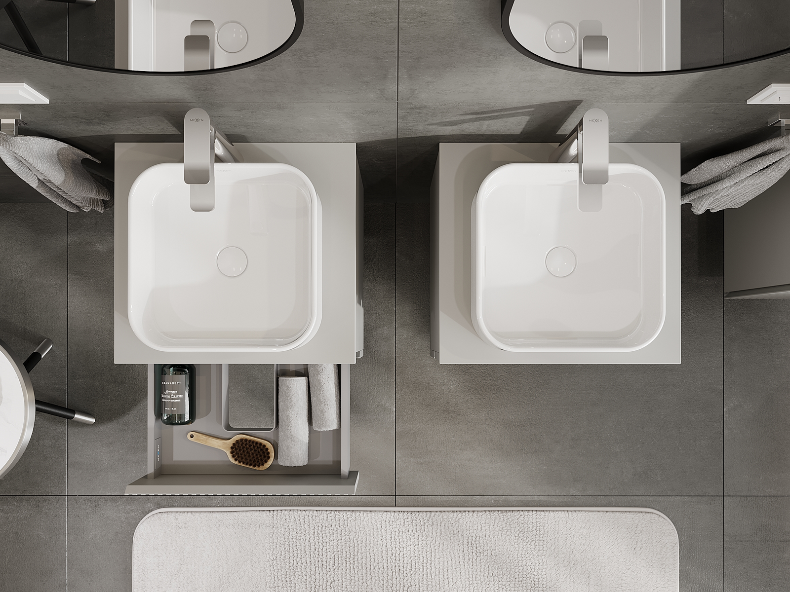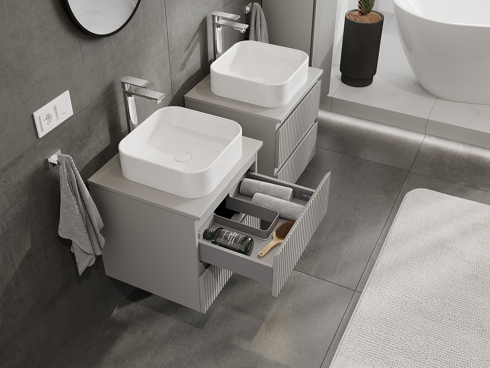 Mūsų moduliniai vonios baldai gali būti derinami tarpusavyje įvairiomis spalvų konfigūracijomis, leidžiant visiškai pritaikyti pagal asmeninius poreikius. Galima pasirinkti tiek atskirų elementų išvaizdą, tiek funkcijas, kas leidžia baldus pritaikyti pagal savo stiliaus ir naudojimo preferencijas.