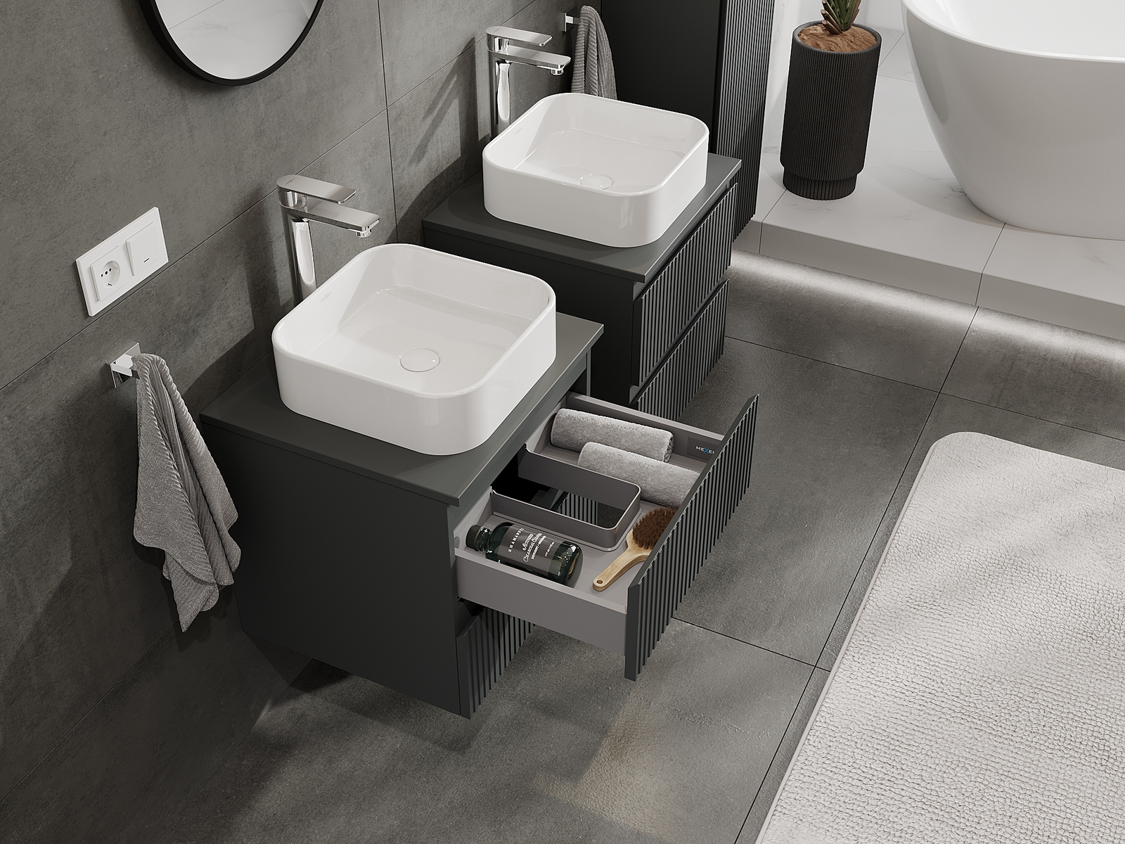 Mūsų moduliniai vonios baldai gali būti derinami tarpusavyje įvairiomis spalvų konfigūracijomis, leidžiant visiškai pritaikyti pagal asmeninius poreikius. Galima pasirinkti tiek atskirų elementų išvaizdą, tiek funkcijas, kas leidžia baldus pritaikyti pagal savo stiliaus ir naudojimo preferencijas.