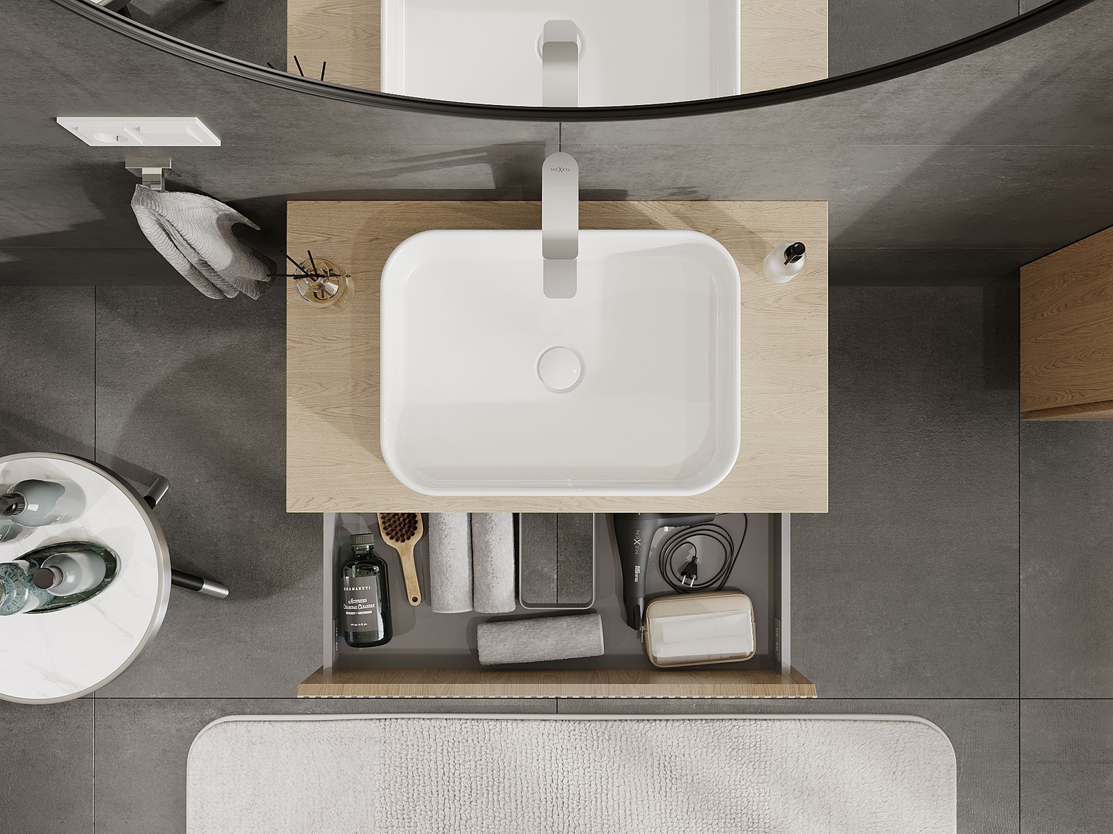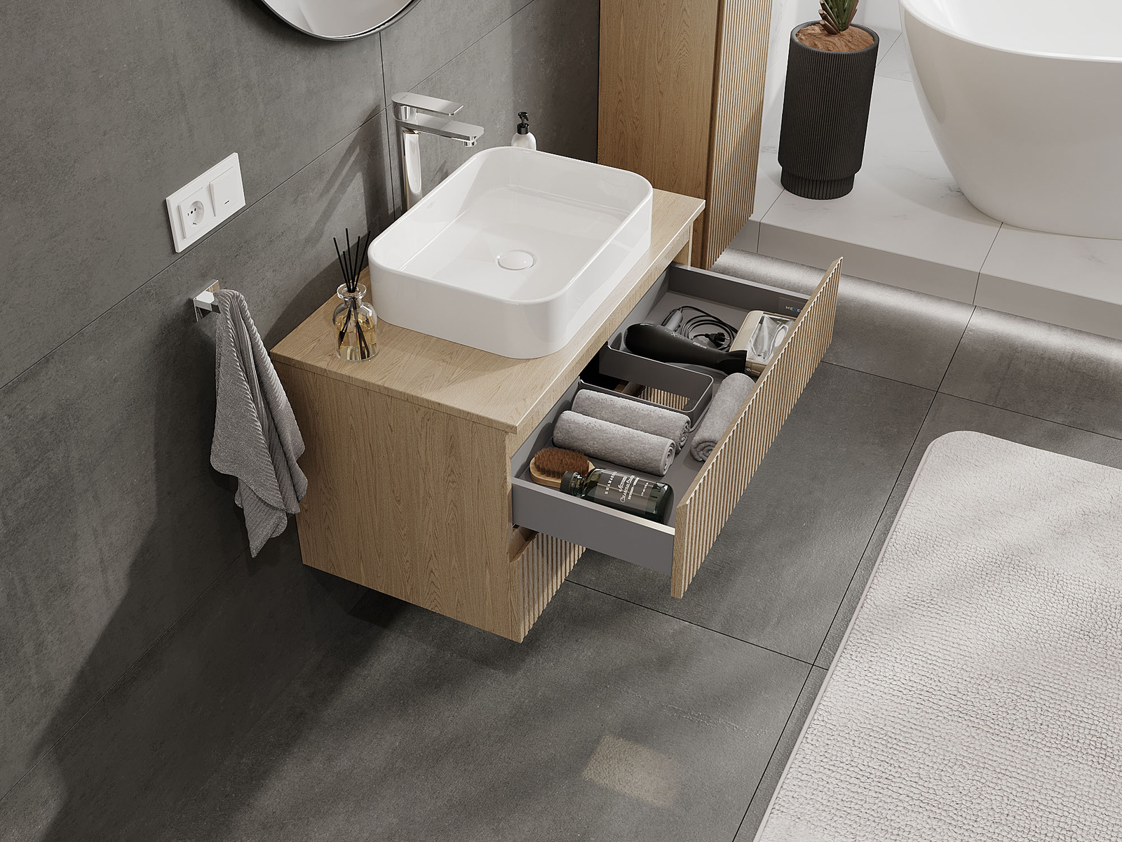 Mūsų moduliniai vonios baldai gali būti derinami tarpusavyje įvairiomis spalvų konfigūracijomis, leidžiant visiškai pritaikyti pagal asmeninius poreikius. Galima pasirinkti tiek atskirų elementų išvaizdą, tiek funkcijas, kas leidžia baldus pritaikyti pagal savo stiliaus ir naudojimo preferencijas.