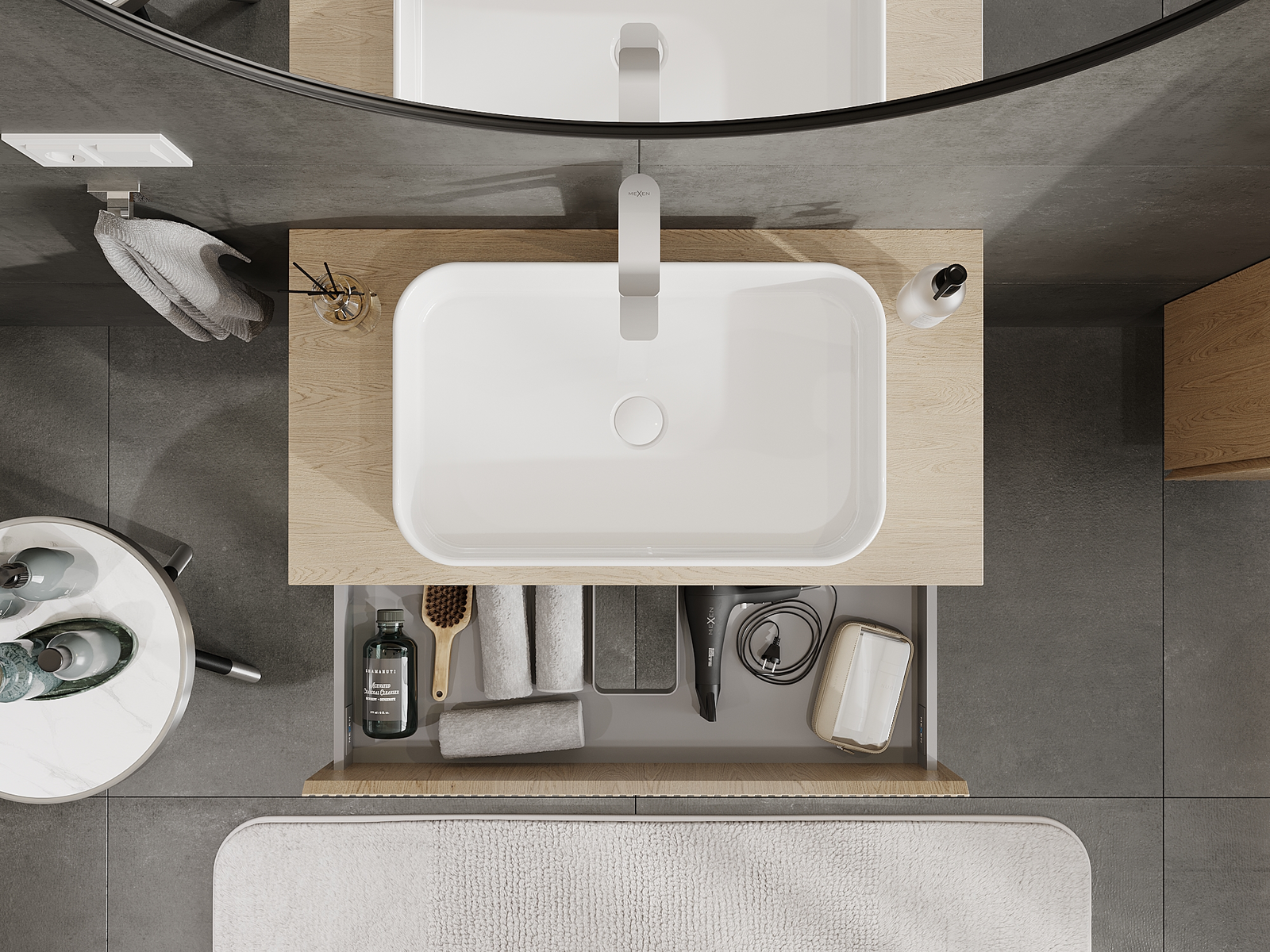 Mūsų moduliniai vonios baldai gali būti derinami tarpusavyje įvairiomis spalvų konfigūracijomis, leidžiant visiškai pritaikyti pagal asmeninius poreikius. Galima pasirinkti tiek atskirų elementų išvaizdą, tiek funkcijas, kas leidžia baldus pritaikyti pagal savo stiliaus ir naudojimo preferencijas.