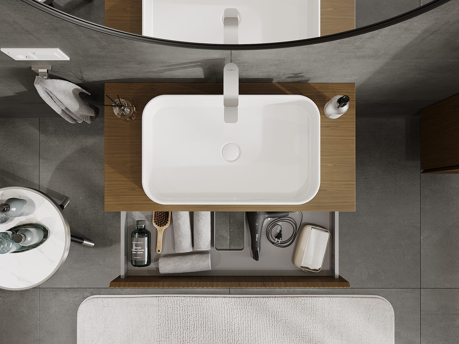 Mūsų moduliniai vonios baldai gali būti derinami tarpusavyje įvairiomis spalvų konfigūracijomis, leidžiant visiškai pritaikyti pagal asmeninius poreikius. Galima pasirinkti tiek atskirų elementų išvaizdą, tiek funkcijas, kas leidžia baldus pritaikyti pagal savo stiliaus ir naudojimo preferencijas.
