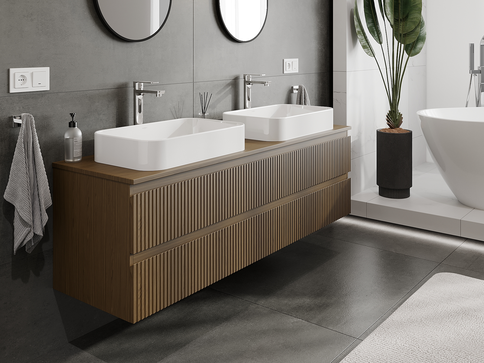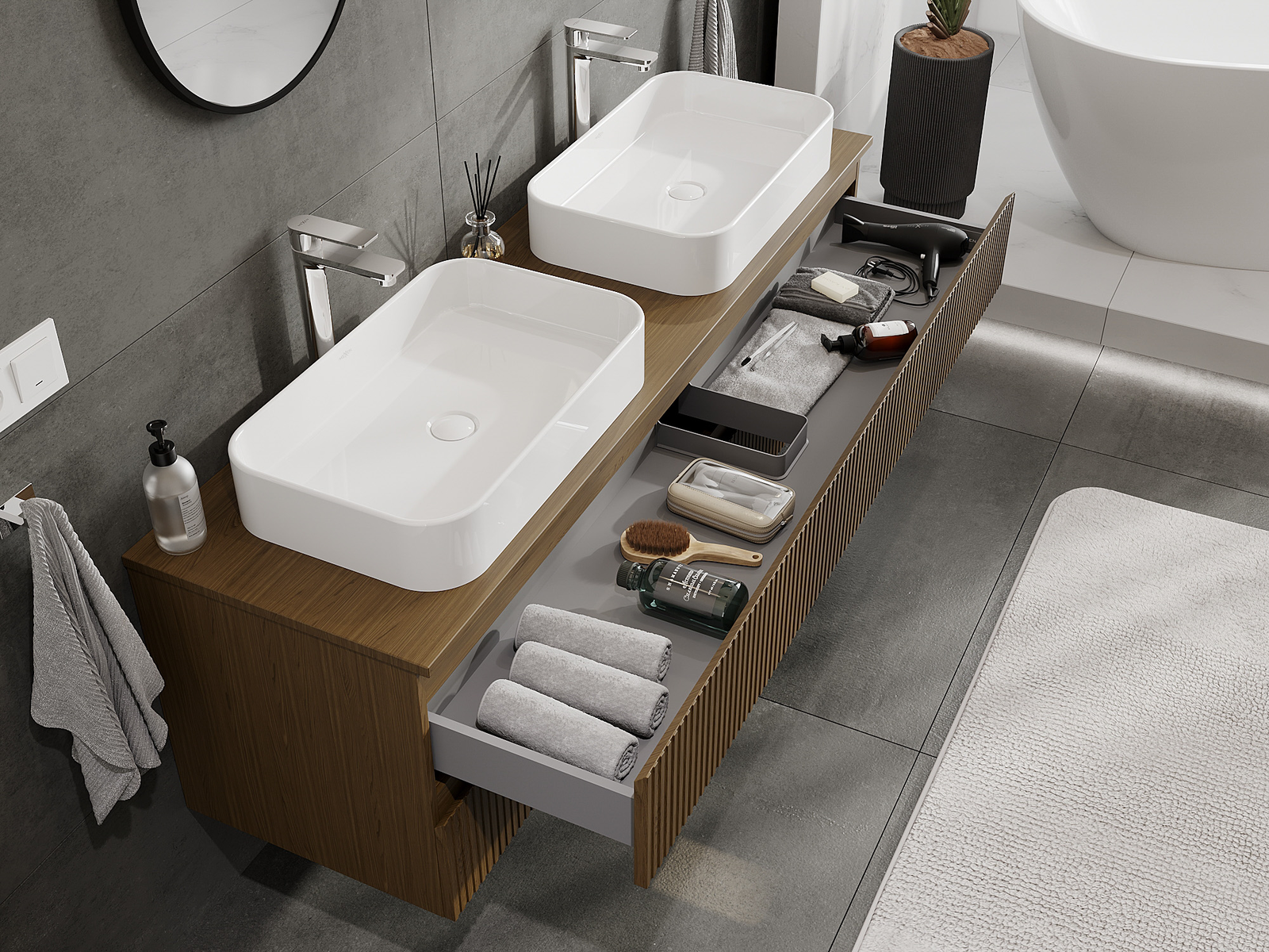 Mūsų moduliniai vonios baldai gali būti derinami tarpusavyje įvairiomis spalvų konfigūracijomis, leidžiant visiškai pritaikyti pagal asmeninius poreikius. Galima pasirinkti tiek atskirų elementų išvaizdą, tiek funkcijas, kas leidžia baldus pritaikyti pagal savo stiliaus ir naudojimo preferencijas.