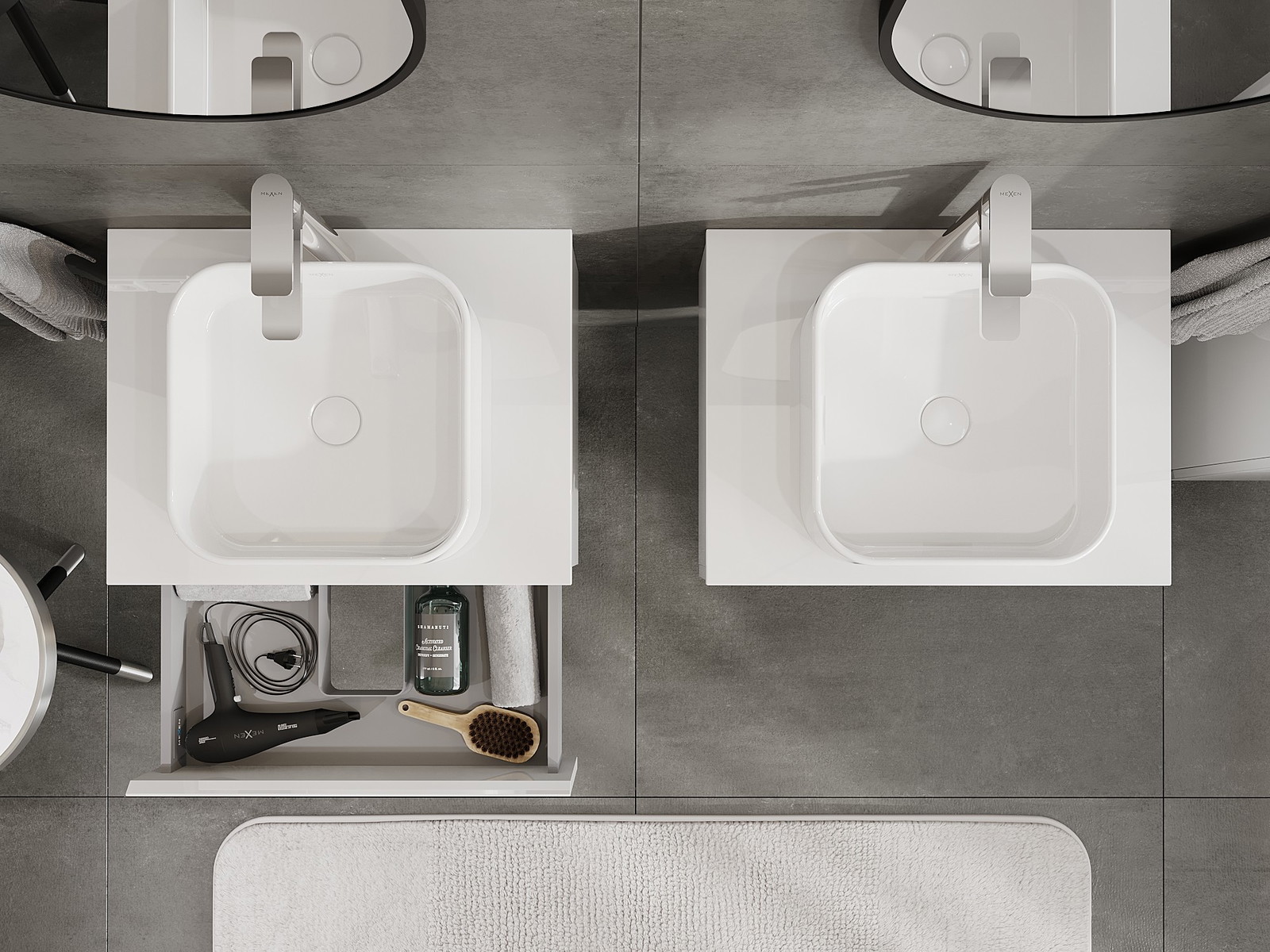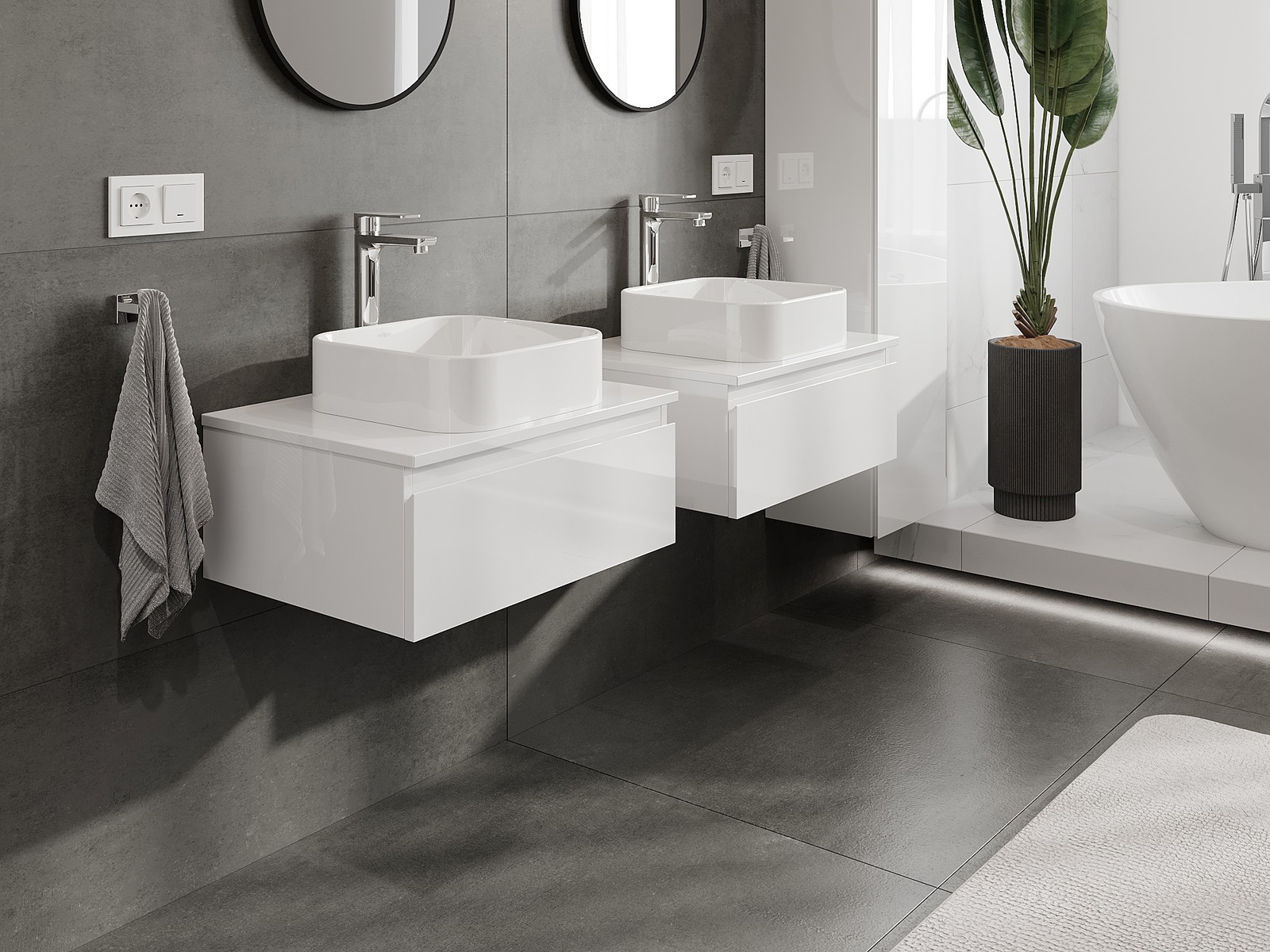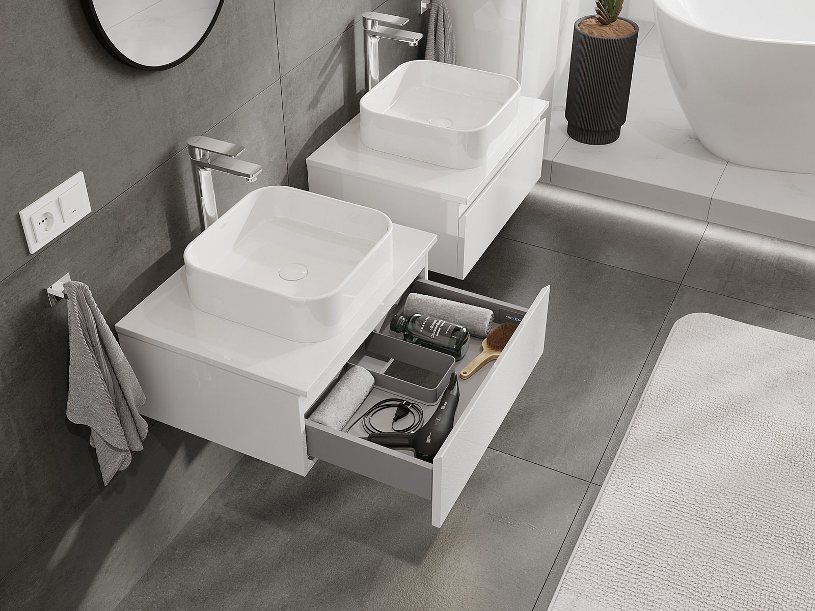 Mūsų moduliniai vonios baldai gali būti derinami tarpusavyje įvairiomis spalvų konfigūracijomis, leidžiant visiškai pritaikyti pagal asmeninius poreikius. Galima pasirinkti tiek atskirų elementų išvaizdą, tiek funkcijas, kas leidžia baldus pritaikyti pagal savo stiliaus ir naudojimo preferencijas.