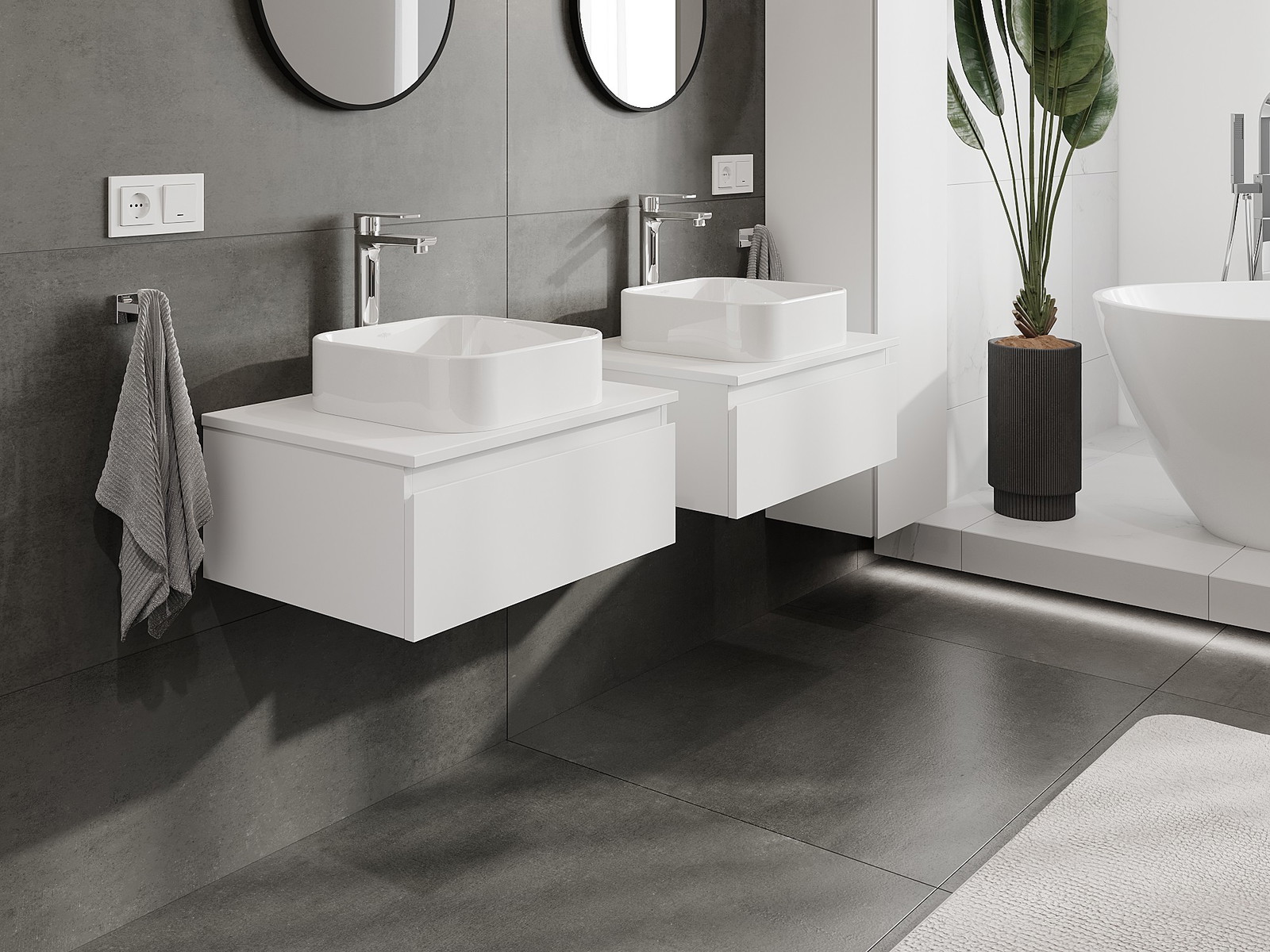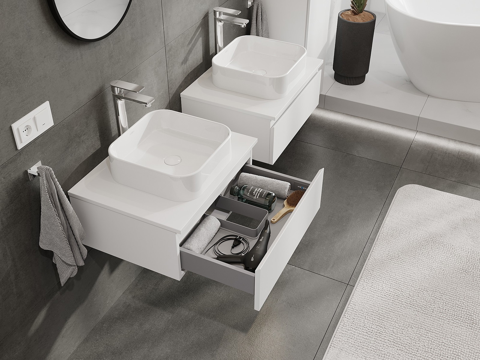 Mūsų moduliniai vonios baldai gali būti derinami tarpusavyje įvairiomis spalvų konfigūracijomis, leidžiant visiškai pritaikyti pagal asmeninius poreikius. Galima pasirinkti tiek atskirų elementų išvaizdą, tiek funkcijas, kas leidžia baldus pritaikyti pagal savo stiliaus ir naudojimo preferencijas.