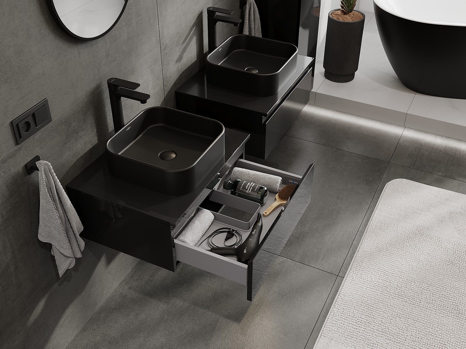 Mūsų moduliniai vonios baldai gali būti derinami tarpusavyje įvairiomis spalvų konfigūracijomis, leidžiant visiškai pritaikyti pagal asmeninius poreikius. Galima pasirinkti tiek atskirų elementų išvaizdą, tiek funkcijas, kas leidžia baldus pritaikyti pagal savo stiliaus ir naudojimo preferencijas.