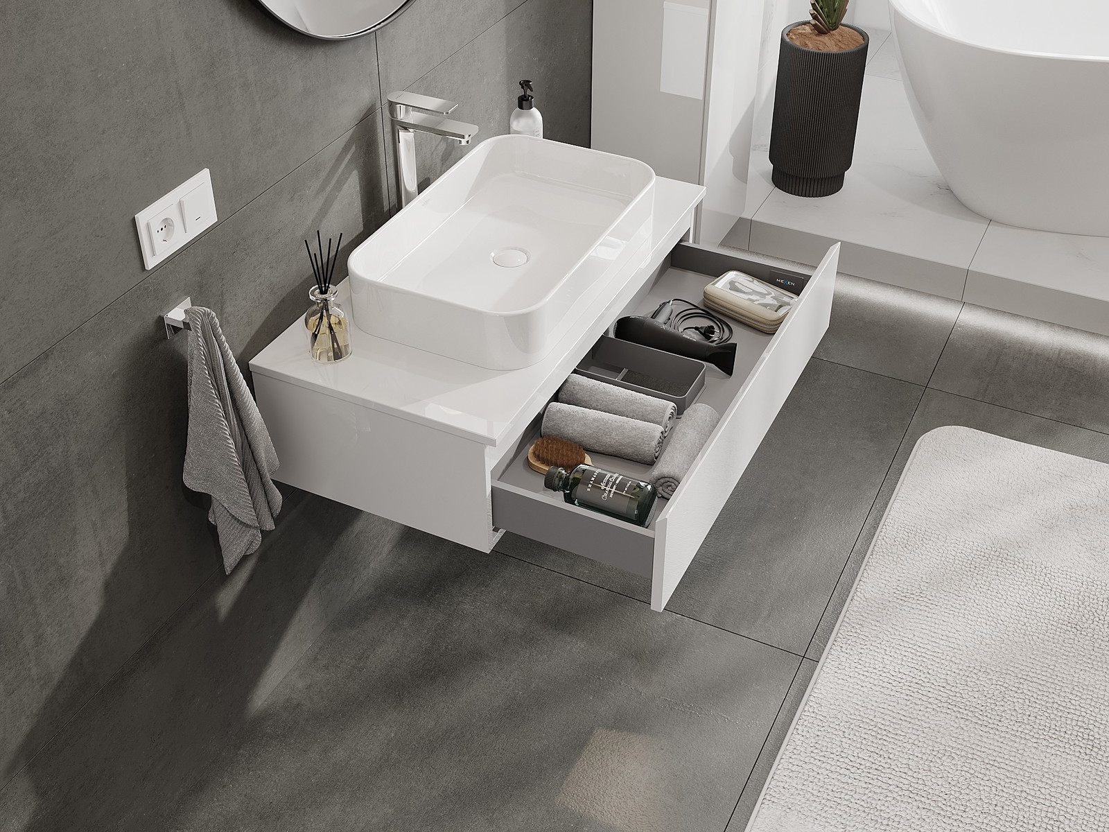Mūsų moduliniai vonios baldai gali būti derinami tarpusavyje įvairiomis spalvų konfigūracijomis, leidžiant visiškai pritaikyti pagal asmeninius poreikius. Galima pasirinkti tiek atskirų elementų išvaizdą, tiek funkcijas, kas leidžia baldus pritaikyti pagal savo stiliaus ir naudojimo preferencijas.