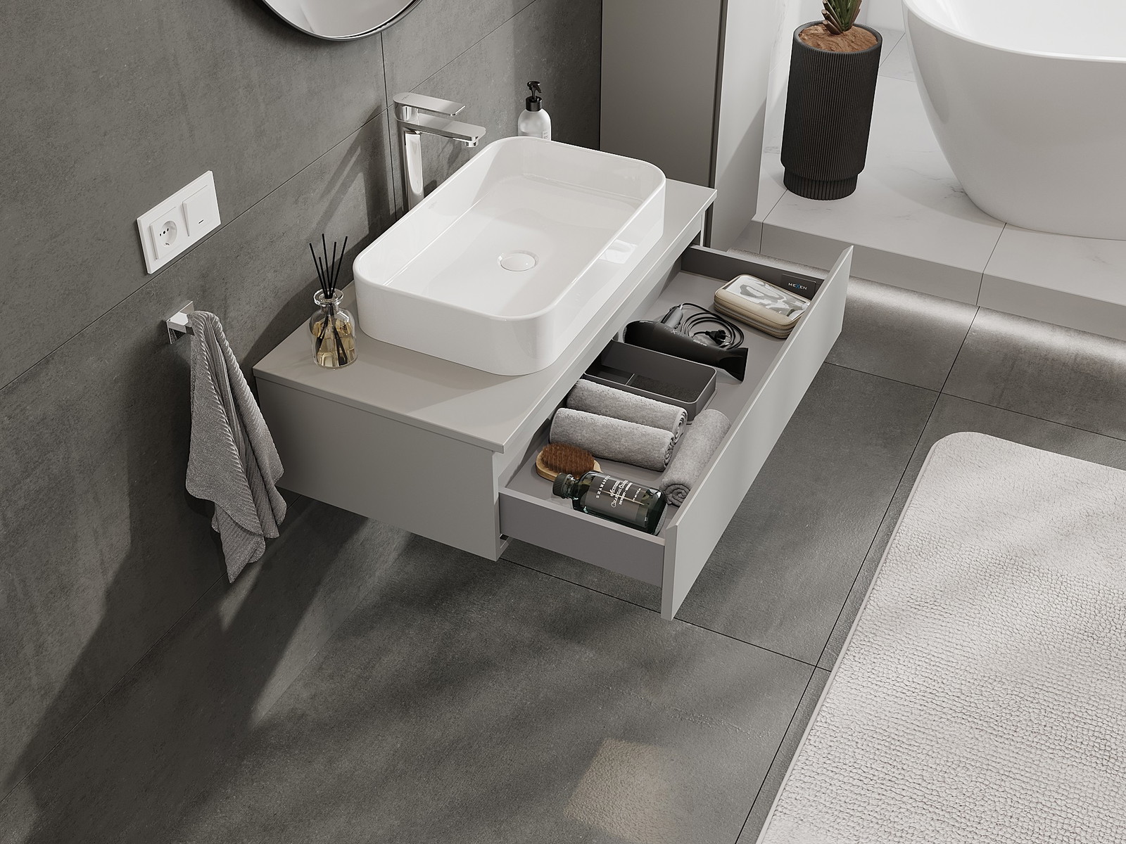 Mūsų moduliniai vonios baldai gali būti derinami tarpusavyje įvairiomis spalvų konfigūracijomis, leidžiant visiškai pritaikyti pagal asmeninius poreikius. Galima pasirinkti tiek atskirų elementų išvaizdą, tiek funkcijas, kas leidžia baldus pritaikyti pagal savo stiliaus ir naudojimo preferencijas.